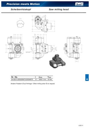 P .# Precision meets Motion Scheibenfräskopf Saw milling head NMBYAX'ÚSCBUFTTTFESR PP Z(5:1) Z n2 n1 'SBFTFSXFMMFBVTUBVTDICBS 3PINDLEÚREMOVABLE P Nr. / No. i nmax Tmax 64.6027LB2000BMTI2Z65MB75 2:1 3000 1/min 40 Nm 6 Andere Fräsdorn Ø auf Anfrage / Other milling arbor Ø on request 6.50.11