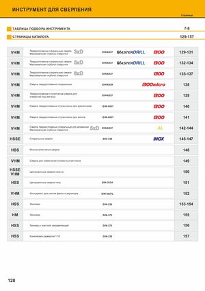 WKИНСТРУМЕНТ ДЛЯ СВЕРЛЕНИЯ Страница ТАБЛИЦА ПОДБОРА ИНСТРУМЕНТА 7-8 СТРАНИЦЫ КАТАЛОГА 129-157 VHM Твердосплавные спиральные сверла 3xDМаксимальная глубина отверстияDIN-6537 MASTERDRILL 1300 129-131 VHM Твердосплавные спиральные сверла 5xDМаксимальная глубина отверстияDIN-6537 MASTERDRILL 1300 132-134 VHM Твердосплавные спиральные сверла 8xDМаксимальная глубина отверстияDIN-6537 1300 135-137 VHM Сверла твердосплавные спиральные DIN-6539 1300micro 138 Твердосплавные ступенчатые сверла для VHM Обрабаотытввеаресмтыийе пмоадтемреитачлиыки DIN-6537 P M K 1300 139 N S H VHM внутренСневееролхалатжведредноисеплавные ступенчатые для раскатников ~DIN-6537 IK 1300 140 Изготовлено из Покрытие VHM Сверла твердосплавные ступенчатые для винтов ~DIN-6537 1300 141 Nakrój / Chamfer VHM VHM Сверла твердосплавные спиральные для алюминияМаксимальная глубина отверстия5xDDIN-6537 AL 142-144 HSSE Спиральные сверла DIN-338 INOX 145-147 6HSS Многоступенчатые сверла 148 VHM Сверла для извлечения сломанных метчиков 149 HSSE Центровочные сверла типа nc 150 VHM HSS Центровочные сверла типа DIN-333A 151 7 VHM Инструмент для снятия фасок и заусенцев DIN-6537L 152 HSS Зенковки DIN-335 153-154 HM Зенковки DIN-373 155 HSS Зенкеры с жесткой направляющей DIN-373 156 HSS Конические развертки 1:16 DIN-335 157 Пример заказа Доступнo со склада 128 По запросу