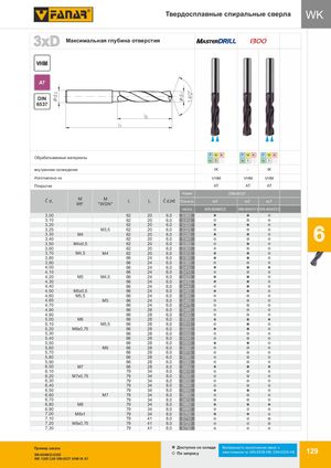 Твердосплавные спиральные сверла WK 3xD Максимальная глубина отверстия MASTERDRILL 1300 VHM AT DIN 6537 P M PK M K P M K P M K Обрабатываемые материалы N S NH S H N S H N S H внутреннее охлаждение IK IK - IK Изготовлено из VHM VHM VHM VHM Покрытие AT AT AT AT Nakrój / Chamfer Норма DIN-6537 Ć d1 MMF M"WGN" l1 l2 Ćd2h6 Точность m7 m7 m7 INDEX W9-604M33 W9-604013 W9-604033 3,00 62 20 6,0 0300 3,10 62 20 6,0 0310 3,20 62 20 6,0 0320 3,25 M3,5 62 20 6,0 03253,30M462206,003303,4062206,00340 6 3,50 M4x0,5 62 20 6,0 0350 3,60 62 20 6,0 0360 3,70 M4,5 M4 62 20 6,0 0370 3,80 66 24 6,0 0380 3,90 66 24 6,0 0390 4,00 66 24 6,0 04004,1066246,004104,20M5M4,566246,00420 7 4,30 66 24 6,0 0430 4,40 66 24 6,0 0440 4,50 M5x0,5 66 24 6,0 0450 4,60 M5,5 66 24 6,0 0460 4,65 M5 66 24 6,0 0465 4,70 66 24 6,0 0470 4,80 66 28 6,0 0480 4,90 66 28 6,0 0490 5,00 M6 66 28 6,0 0500 5,10 M5,5 66 28 6,0 0510 5,20 M6x0,75 66 28 6,0 0520 5,30 66 28 6,0 0530 5,40 66 28 6,0 0540 5,50 66 28 6,0 0550 5,60 M6 66 28 6,0 0560 5,70 66 28 6,0 0570 5,80 66 28 6,0 0580 5,90 66 28 6,0 0590 6,00 M7 66 28 6,0 0600 6,10 79 34 8,0 0610 6,20 M7x0,75 79 34 8,0 0620 6,30 79 34 8,0 0630 6,40 79 34 8,0 0640 6,50 79 34 8,0 0650 6,60 M7 79 34 8,0 0660 6,70 79 34 8,0 0670 6,80 M8 79 34 8,0 0680 6,90 79 34 8,0 0690 7,00 M8x1 79 34 8,0 0700 7,10 79 41 8,0 0710 7,20 M8x0,75 79 41 8,0 0720 7,30 79 41 8,0 0730 Пример заказа Доступнo со склада Возможность выполнения сверл с W9-604M33-0300 По запросу хвостовиком по DIN-6535-HB, DIN-6535-HE 129 WK 1300 3,00 DIN-6537 VHM IK AT