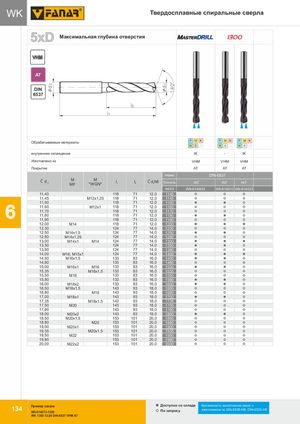 WK Твердосплавные спиральные сверла 5xD Максимальная глубина отверстия MASTERDRILL 1300 VHM AT DIN 6537 P M PK M K P M K P M K Обрабатываемые материалы N S NH S H N S H N S H внутреннее охлаждение IK IK - IK Изготовлено из VHM VHM VHM Покрытие AT AT AT Nakrój / Chamfer Норма DIN-6537 VHM Ćd 1 MMF M"WGN" l1 l2 Ćd2h6 Точность m7 m7 m7 INDEX W9-614M33 W9-614013 W9-614033 11,40 118 71 12,0 1140 11,45 M12x1,25 118 71 12,0 1145 11,50 118 71 12,0 1150 11,60 M12x1 118 71 12,0 1160 6 11,7011,80 118 71 12,0 11701187112,01180 11,90 118 71 12,0 1190 12,00 M14 118 71 12,0 1200 12,30 124 77 14,0 1230 12,50 M14x1,5 124 77 14,0 1250 12,80 M14x1,25 124 77 14,0 1280 13,00 M14x1 M14 124 77 14,0 1300 13,50 124 77 14,0 1350 13,80 124 77 14,0 1380 14,00 M16; M15x1 124 77 14,0 1400 14,50 M16x1,5 133 83 16,0 1450 14,80 133 83 16,0 1480 15,00 M16x1 M16 133 83 16,0 1500 7 15,35 M16x1,5 133 83 16,0 153515,50M181338316,0155015,801338316,01580 16,00 M18x2 133 83 16,0 1600 16,50 M18x1,5 143 93 18,0 1650 16,80 M18 143 93 18,0 1680 17,00 M18x1 143 93 18,0 1700 17,35 M18x1,5 143 93 18,0 1735 17,50 M20 143 93 18,0 1750 17,80 143 93 18,0 1780 18,00 M20x2 143 93 18,0 1800 18,50 M20x1,5 153 101 20,0 1850 18,80 M20 153 101 20,0 1880 19,00 M20x1 153 101 20,0 1900 19,35 M20x1,5 153 101 20,0 1935 19,50 M22 153 101 20,0 1950 19,80 153 101 20,0 1980 20,00 M22x2 153 101 20,0 2000 Пример заказа Доступнo со склада Возможность выполнения сверл с 134 W9-614013-1200 По запросу хвостовиком по DIN-6535-HB, DIN-6535-HE WK 1300 12,00 DIN-6537 VHM AT
