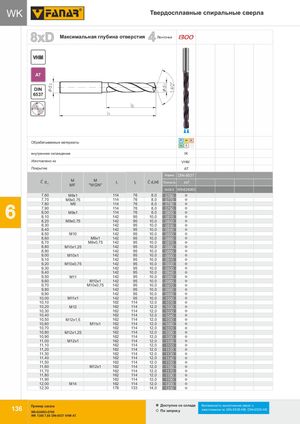 WK Твердосплавные спиральные сверла 8xD Максимальная глубина отверстия 4 Ленточки 1300 VHM AT DIN 6537 P M K Обрабатываемые материалы N S H внутреннее охлаждение IK Изготовлено из VHM Покрытие AT Nakrój / Chamfer Норма DIN-6537 VHM Ćd 1 MMF M"WGN" l1 INDEXl2Ćd2h6 Точность m7 INDEX W9-624063 7,60 M8x1 114 76 8,0 0760 7,70 M8x0,75 114 76 8,0 0770 7,80 M9 114 76 8,0 0780 6 7,908,00 M9x18,10 114 76 8,0 0790114768,008001429510,00810 8,20 M9x0,75 142 95 10,0 0820 8,30 142 95 10,0 0830 8,40 142 95 10,0 0840 8,50 M10 142 95 10,0 0850 8,60 M9x1 142 95 10,0 0860 8,70 M9x0,75 142 95 10,0 0870 8,80 M10x1,25 142 95 10,0 0880 8,90 142 95 10,0 0890 9,00 M10x1 142 95 10,0 0900 9,10 142 95 10,0 0910 9,20 M10x0,75 142 95 10,0 0920 9,30 142 95 10,0 0930 7 9,409,50 M11 142 95 10,0 09401429510,00950 9,60 M10x1 142 95 10,0 0960 9,70 M10x0,75 142 95 10,0 0970 9,80 142 95 10,0 0980 9,90 142 95 10,0 0990 10,00 M11x1 142 95 10,0 1000 10,10 162 114 12,0 1010 10,20 M12 162 114 12,0 1020 10,30 162 114 12,0 1030 10,40 162 114 12,0 1040 10,50 M12x1,5 162 114 12,0 1050 10,60 M11x1 162 114 12,0 1060 10,70 162 114 12,0 1070 10,80 M12x1,25 162 114 12,0 1080 10,90 162 114 12,0 1090 11,00 M12x1 162 114 12,0 1100 11,10 162 114 12,0 1110 11,20 162 114 12,0 1120 11,30 162 114 12,0 1130 11,40 162 114 12,0 1140 11,50 162 114 12,0 1150 11,60 M12x1 162 114 12,0 1160 11,70 162 114 12,0 1170 11,80 162 114 12,0 1180 11,90 162 114 12,0 1190 12,00 M14 162 114 12,0 1200 12,30 178 133 14,0 1230 Пример заказа Доступнo со склада Возможность выполнения сверл с 136 W9-624063-0760 По запросу хвостовиком по DIN-6535-HB, DIN-6535-HE WK 1300 7,60 DIN-6537 VHM AT