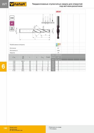 WKT Твердосплавные ступенчатые сверла для отверстий под метчики-раскатники 1300 VHM AT DIN ~6537 P M K Обрабатываемые материалы N S H Ивнсупторленненнеиееохлаждение 9I0K° Изготовлено из VHM Покрытие AT Nakrój / Chamfer Норма ~DIN-6537 VHM Ćd 1 MMF l1 l3 Ćd 2 Ćd2h6 Точность m7 INDEX W9-704010 2,35 M2,5 60 10 4 4 0235 2,80 M3 62 12 4 4 0280 3,70 M4 64 14 6 6 0370 6 4,65 M5 80 20 6 6 04655,55M680248805557,45M8803010100745 9,30 M10 90 40 12 12 0930 11,20 M12 100 45 14 14 1120 7 Пример заказа Доступнo со склада 140 W9-704010-0235 По запросу WT 1300 2,35 DIN-6537 VHM
