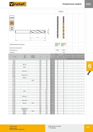 Спиральные сверла WK INOX HSSE TN2 DIN 338 P M K P M K Обрабатываемые материалы N S H N S H внутреннее охлаждение IK- - Изготовлено из HVSHSME HSSE Покрытие A-T TN2 Nakrój / Chamfer Норма DIN-338 M M MF Ćd 1 MF "WGN" l1 l2 Точность h8 h8 INDEX W2-101811 W2-103811 9,70 133 87 0970 9,80 133 87 0980 9,90 133 87 0990 10,00 M11x1 133 87 1000 10,10 133 87 101010,20M12133871020 6 10,30 133 87 1030 10,40 133 87 1040 10,50 M12x1,5 133 87 1050 10,60 133 87 1060 10,70 142 94 1070 10,80 M12x1,25 142 94 108010,9014294109011,00M12x1142941100 7 11,10 142 94 1110 11,20 M12 142 94 1120 11,30 142 94 1130 11,40 142 94 1140 11,50 142 94 1150 11,60 142 94 1160 11,70 142 94 1170 11,80 142 94 1180 11,90 151 101 1190 12,00 M14 151 101 1200 12,10 151 101 1210 12,20 151 101 1220 12,30 151 101 1230 12,50 M14x1,5 151 101 1250 12,60 151 101 1260 12,70 151 101 1270 12,80 M14x1,25 151 101 1280 12,90 151 101 1290 13,00 M14x1 M14 151 101 1300 13,20 151 101 1320 13,50 160 108 1350 13,80 160 108 1380 14,00 M16;M15x1 160 108 1400 14,50 M16x1,5 169 114 1450 15,00 M16x1 M16 169 114 1500 15,50 M18 178 120 1550 16,00 M18x2 178 120 1600 Пример заказа Доступнo со склада W2-101811-0970 По запросу 147 WK INOX 9,70 DIN-338 HSSE TN2