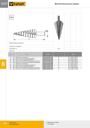 WWSKT Многоступенчатые сверла HSS P M K Обрабатываемые материалы - N S H внутреннее охлаждение IK - Изготовлено из HSS Покрытие - Nakrój / Chamfer VHM Ćd LL ĆD INDEX Имя 8 Tole7ra5ncj4a/6/8/10/12/14/16/18/20 W1-641010-0420 Nr 1 HSS 4-20mm 10 100 6/8/10/12/14/16/18/20/22/24/26/28/30 W1-641020-0630 Nr 2 HSS 6-30mm 10 100 6/9/13/16/19/21/23/26/29/32/35/38 W1-641030-0638 Nr 3 HSS 6-38mm 10 100 6/9/11,4/14/17,25/19/21,25/24/26,75/30/33/35,7 W1-642030-0636 PG 3 HSS 6-36mm 10 100 6/9/12,5/15,2/18,6/20,4/22,5/26/28,3/30,5/34/37 W1-642040-0637 PG 4 HSS 6-37mm 6 8 75 4/6/8/10/12/14/16/18/20101006/8/10/12/14/16/18/20/22/24/26/28//30W1-648010-0420W1-648020-0630 Nr 1 HSS 4-20mmNr 2 HSS 6-30mm 10 100 6/9/13/16/19/21/23/26/29/32/35/38 W1-648030-0638 Nr 3 HSS 6-38mm 10 100 6/9/11,4/14/17,25/19/21,25/24/26,75/30/33/35,7 W1-645030-0636 PG 3 HSS 6-36mm 10 100 6/9/12,5/15,2/18,6/20,4/22,5/26/28,3/30,5/34/37 W1-645040-0637 PG 4 HSS 6-37mm 7 Пример заказа Доступнo со склада 148 WST W1-641010-0420 По запросу