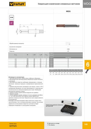 Сверла для извлечения сломанных метчиков WWDKG WDG VHM AT P M K P M K Обрабатываемые материалы N S H N S H внутреннее охлаждение IK - Изготовлено из VHM VHM Покрытие AT AT Nakrój / Chamfer Норма - Ć d1 M l ±21 l ±22 Ć d2 Точность INDEX W9-900002 2,5 M3 38 10 3 0250 3,3 M4 46 14 4 0330 4,2 M5 50 19 5 0420 5,0 M6 50 23 6 0500 6,8 M8 60 23 8 06808,5M108025100850 6 10,2 M12 80 35 12 1020 кормить fz fz fz fz fz Vc m/min ϕ 3,3-6,8 ϕ 6,8-10,2 ϕ10,2-14,0 ϕ14,0-15,5 ϕ15,5-17,5 od do od do od do od do od do od do 10 12 0,040 0,08 0,08 0,110 0,110 0,140 0,140 0,150 0,150 0,170 7 Инструкция по эксплуатации: 1. Заготовка должна быть зажата очень стабильно и безопасно. 2. Выстающая часть метчика должна находиться в одной плоскости с заготовкой. 3. Центровочное отверстие необходимо сформировать с помощью нескольких начальных подходов в насверливании первоначальной точки 4. Удаление метчика можно производить при помощи станка с ЧПУ с охлаждением (Внимание: есть риск заклинивания), а также вручную на настольном или напольном сверлильном станке. Необходимо многократное удаление стружки. 5. Удалите остатки стружки сжатым воздухом или скребком. 6. Нарежьте резьбу 7. После нарезания резьбы проверьте точность размеров калибром. От 1 до 5 метчиков может быть удалено одним сверлом для удаления сломанных метчиков. Перезаточка такого сверла является не экономичной. Благодаря шестигранной форме сверло может быть зажато как в трех-кулачковых, так и в четырех-кулачковых патронах. При условии правильного использования отверстие в заготовке не будет повреждено независимо от используемого материала. Сверла для удаления сломанных метчиков 208 Пример заказа Доступнo со склада W9-900002-0250 По запросу 149 WDG 2,5 VHM AT