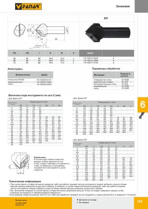 Зенковки WK PF INDEX 25,5 1 T9-100013-0400 20,5 2 T9-100012-0560 14,5 2 T9-100011-0720 Аксессуары P MПKараметры обработки Обрабатываемые материалы N S H Маркированиевнутреннее охлаждениеINDEX Подача fIKМатериал(мм/зуб) ПластинИказгоАтНов3л3е0но из T9-104000-0127 VHM Углеродистая сталь Крепежный винтПокрытие T9-100001-0000КлючT9-100002-0000 жаропрочные сплавыATИнструментальная сталь Nakrój / Chamfer нержавеющий Чугун Величина хода инструмента по оси Z (мм) - Для фаски 30° - Для фаски 45° Размер фаски C (mm)Диаметр отверстияĆd (mm) Размер фаски C (mm)Диаметр отверстияĆd (mm)6 7 - Для фаски 60° Размер фаски C (mm) Диаметр отверстия Ćd (mm) Примечание: В случае когда глубина отверстия меньше глубины врезания по оси Z (Zd), следует соблюдать осторожность, чтобы не произошло столкновения торцевой части инструмента с дном отверстия. Техническая информация • При снятии фасок у отверстий малого диаметра, либо при работе торцевой частью инструмента следует выбирать скорость ближе верхней границы диапазона скоростей в таблице. И наоборот, в случае отверстий большого диаметра, либо при работе основной частью инструмента следует выбирать скорость ближе нижней границы диапазона скоростей в таблице. • При выполении операции по снятию фаски у отверстий малых диаметров (меньше 10 мм) не следует прерывать процесс путем отнимания инструмента от обрабатываемой поверхности. • Если диаметр отверстия меньше чем ø10 mm, либо при обработке торцевой частью инсрумента, подача должна быть в пределах 0.15 мм/зуб. Пример заказа Доступнo со склада T9-100013-0400 По запросу 155 Зенкеры 40