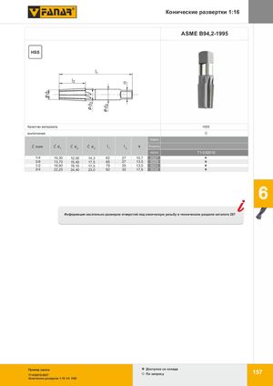 Конические развертки 1:16 WK ASME B94,2-1995 HSS Качество материала P M K HSS Обрабатываемые материалы выполнение N S H C внутреннее охлаждение Норма IK ИзĆготnоoвлmено из Ć d1 Ć d2 Ć d3 l 1 l 2 a Точность VHM Покрытие INDEX AT T1-030010 1/4Nakrój / Chamfer10,30 12,00 14,3 62 27 10,7 0027 3/8 13,70 15,40 17,5 65 27 13,5 0029 1/2 16,90 19,10 17,5 79 35 13,0 0031 3/4 22,25 24,40 23,0 82 35 17,5 0035 6 Информация касательно размеров отверстий под коническую резьбу в техническом разделе каталога 267 7 Пример заказа Доступнo со склада T1-030010-0027 По запросу 157 Конические развертки 1:16 1/4 HSS
