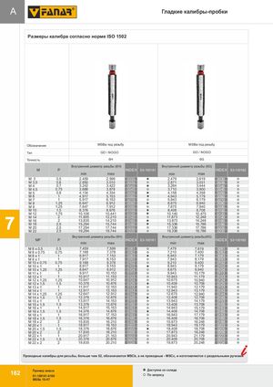 A Гладкие калибры-пробки Размеры калибра согласно норме ISO 1502 Обозначение MSBa под резьбу MSBa под резьбу Тип GO / NOGO GO / NOGO Точность 6H 6G Внутренний диаметр резьбы (6H) Внутренний диаметр резьбы (6G) M P INDEX S3-100161 INDEX S3-100162 min max min max M. 3 0,5 2,459 2,599 0030 2,479 2,619 0030 M 3,5 0,6 2,850 3,010 0035 2,871 3,031 0035 M4 0,7 3,242 3,422 0040 3,264 3,444 0040 M 4,5 0,75 3,688 3,878 0045 3,710 3,900 0045 M5 0,8 4,134 4,334 0050 4,158 4,358 0050 M6 1 4,917 5,153 0060 4,943 5,179 0060 M7 1 5,917 6,153 0070 5,943 6,179 0070 M8 1,25 6,647 6,912 0080 6,675 6,940 0080 M9 1,25 7,647 7,912 0090 7,675 7,940 0090 M 10 1,5 8,376 8,676 0100 8,408 8,708 0100 M 12 1,75 10,106 10,441 0120 10,140 10,475 0120 67 M 14M 16M 18M 20 2 11,835 12,210 0140213,83514,21001602,515,29415,74401802,517,29417,744020011,87312,248014013,87314,248016015,33615,786018017,33617,7860200 M 22 2,5 19,294 19,744 0220 19,336 19,786 0220 Внутренний диаметр резьбы (6H) Внутренний диаметр резьбы(6G) MF P INDEX S3-100161 INDEX S3-100162 min max min max M.8 x 0,5 0,5 7,459 7,599 0081 7,479 7,619 0081 M 8 x 0,75 0,75 7,188 7,378 0082 7,210 7,400 0082 M8x1 1 6,917 7,153 0083 6,943 7,179 0083 M9x1 1 7,917 8,153 0093 7,943 8,179 0093 M 10 x 0,75 0,75 9,188 9,378 0102 9,210 9,400 0102 M 10 x 1 1 8,917 9,153 0103 8,943 9,179 0103 M 10 x 1,25 1,25 8,647 8,912 0104 8,675 8,940 0104 M 11 x 1 1 9,917 10,153 0113 9,943 10,179 0113 M 12 x 1 1 10,917 11,153 0123 10,943 11,179 0123 M 12 x 1,25 1,25 10,647 10,912 0124 10,675 10,940 0124 M 12 x 1,5 1,5 10,376 10,676 0125 10,408 10,708 0125 M 13 x 1 1 11,917 12,153 0133 11,943 12,179 0133 M 14 x 1 1 12,917 13,153 0143 12,943 13,179 0143 M 14 x 1,25 1,25 12,647 12,912 0144 12,675 12,940 0144 M 14 x 1,5 1,5 12,376 12,676 0145 12,408 12,708 0145 M 15 x 1 1 13,917 14,153 0153 13,943 14,179 0153 M 15 x 1,5 1,5 13,376 13,676 0155 13,408 13,708 0155 M 16 x 1 1 14,917 15,153 0163 14,943 15,179 0163 M 16 x 1,5 1,5 14,376 14,676 0165 14,408 14,708 0165 M 18 x 1 1 16,917 17,153 0183 16,943 17,179 0183 M 18 x 1,5 1,5 16,376 16,676 0185 16,408 16,708 0185 M 18 x 2 2 15,835 16,210 0186 15,873 16,248 0186 M 20 x 1 1 18,917 19,153 0203 18,943 19,179 0203 M 20 x 1,5 1,5 18,376 18,676 0205 18,408 18,708 0205 M 20 x 2 2 17,835 18,210 0206 17,873 18,248 0206 M 22 x 1 1 20,917 21,153 0223 20,943 21,179 0223 M 22 x 1,5 1,5 20,376 20,676 0225 20,408 20,708 0225 M 22 x 2 2 19,835 20,210 0226 19,873 20,248 0226 Проходные калибры для резьбы, больше чем 52, обозначаются MSCb, а не проходные - MSCc, и изготовляются с раздельными ручками Пример заказа Доступнo со склада 162 S1-100161-0100 По запросу MSBa 10-H7