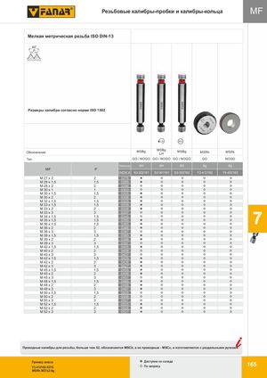 MF Резьбовые калибры-пробки и калибры-кольца MF Мелкая метрическая резьба ISO DIN-13 HS6S0E0 P PM Размеры калибра согласно норме ISO 1502 LH 6G Обозначение MSBg MSBg MSBgLH MSRh MSRk Тип GO / NOGO GO / NOGO GO / NOGO GO NOGO Точность Точность 6H 6H 6G 6g 6g MF P INDEX S3-302161 S3-301161 S3-302162 Y3-412162 Y3-422162 M 27 x 2 2 0276 M 28 x 1,5 1,5 0285 M 28 x 2 2 0286 M 30 x 1 1 0303 M 30 x 1,5 1,5 0305 M 30 x 2 2 0306 M 32 x 1,5 1,5 0325 M 33 x 1,5 1,5 0335 M 33 x 2 2 0336 M 33 x 3 3 0337M 34 x 1,51,50345M 35 x 1,51,50355 67 M 36 x 1,5 1,5 0365 M 36 x 2 2 0366 M 36 x 3 3 0367 M 38 x 1,5 1,5 0385 M 39 x 2 2 0396 M 39 x 3 3 0397 M 40 x 1,5 1,5 0405 M 40 x 2 2 0406 M 40 x 3 3 0407 M 42 x 1,5 1,5 0425 M 42 x 2 2 0426 M 42 x 3 3 0427 M 45 x 1,5 1,5 0455 M 45 x 2 2 0456 M 45 x 3 3 0457 M 48 x 1,5 1,5 0485 M 48 x 2 2 0486 M 48 x 3 3 0487 M 50 x 1,5 1,5 0505 M 50 x 2 2 0506 M 50 x 3 3 0507 M 52 x 1,5 1,5 0525 M 52 x 2 2 0526 M 52 x 3 3 0527 Проходные калибры для резьбы, больше чем 52, обозначаются MSCb, а не проходные - MSCc, и изготовляются с раздельными ручками Пример заказа Доступнo со склада Y3-412162-0276 По запросу 165 MSRh M27x2-6g