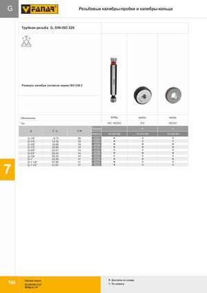 G Резьбовые калибры-пробки и калибры-кольца GG Трубная резьба G, DIN-ISO 228 HS5S5E0 P PM Размеры калибра согласно норме ISO 228-2 Обозначение MSBg MSRh MSRk Тип GO / NOGO GO NOGO Точность Точность A A G Ć d1 1”/P INDEX S3-302180 Y3-412180 Y3-422180 G-1/8” 9,73 28 3123 G-1/4” 13,16 19 3127 G-3/8” 16,66 19 3129 G-1/2” 20,96 14 3131 G-5/8” 22,91 14 3133 G-3/4” 26,44 14 3135 G-7/8” 30,20 14 3137 G-1” 33,25 11 3139 G-1.1/8” 37,90 11 3141 67 G-1.1/4” 41,91 11 3143 Пример заказа Доступнo со склада 168 S3-302180-3127 По запросу MSBg G-1/4”