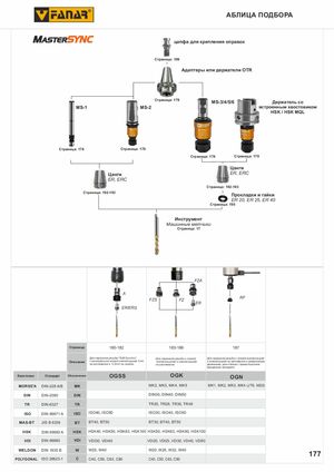 АБЛИЦА ПОДБОРА MASTERSYNC цапфа для крепления оправок Страница: 199 Адаптеры или держатели OTR Страница: 179 MS-3/4/5/6 Держатель со MS-1 MS-2 встроенным хвостовиком HSK / HSK MQL Страница: 178 Страница: 178 Страница: 178 Страница: 179 Цанги Цанги ER, ERC ER, ERC Страница: 192-193 Страница: 192-193 Прокладки и гайки ER 20, ER 25, ER 40 Страница: 195 Инструмент Машинные метчики Страница: 17 FZA A FZS FZ RF ER ER/ERG Страница 180-182 183-186 187 Для нарезания резьбы "Soft Synchro" Для нарезания резьбы с осевой Для нарезания резьбы с осевой компенсацией Описание с минимальной осевой компенсацией 1mm компенсациней и компенсацией и компенсацией на растяжение и реверсивным на растяжение и 0,2mm на сжатие. на растяжение движением, для станков с правосторонним вращением шпинделя. Хвостовик Стандарт Обозначение OGSS OGK OGN MORSE'A DIN-228 A/B MK MK2, MK3, MK4, MK5 MK1, MK2, MK3, MK4 (JT6, M20) DIN DIN-2080 DIN DIN30, DIN40, DIN50 TR DIN-6327 TR TR20, TR28, TR36, TR48 ISO DIN 69871 A ISO ISO40, ISO50 ISO30, ISO40, ISO50 MAS-BT JIS B 6339 BT BT40, BT50 BT30, BT40, BT50 HSK DIN 69893 A HSK HSK40, HSK50, HSK63, HSK100 HSK50, HSK63, HSK80, HSK100 VDI DIN 69880 VDI VDI30, VDI40 VDI20, VDI25, VDI30, VDI40, VDI50 WELDONПримDеINр з1а8к3а5заB W W25, W40 W20, W25, W32, WДо4с0тупнo со склада 177 POLYGONAL ISO 26623-1 C C40, C50, C63, C80 C40, C50, C63, C80По запросу 8