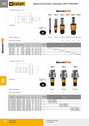 MASTERSYNC MS Держатели метчиков с функцией „SOFT SYNCHRO” · осевая компенсация : +/- 0,5 MASTERSYNC MS-1 MS-2 MS-3 MS-4 MS-5 MS-6 Аксессуары Прокладки и гайки 195 Область применения M1÷M3 M2÷M5 M4,5÷M12 M8÷M20 M16÷M30 M22÷M48 Внутреннее охлаждение - - IK IK IK IK Chwyt Прокладки Модель ХSвhоaсnтkовик Цанги M DD D A H и гайки INDEX MS-1-D12 12 ER8 M1÷M3 12 12 12 28 - R-MS-1-D12 MS-2-W25 25 ER11 M2÷M5 23,5 23,5 19 52 - R-MS-2-W25 MS-3-W25 25 ER20 M4,5÷M12 34,6 36,3 34 69 + R-MS-3-W25 MS-4-W25 25 ER25 M8÷M20 44 45,6 42 88 + R-MS-4-W25 MS-5-W25 25 ER40 M16÷M30 62 63,6 63 117 + R-MS-5-W25 MS-6-W40 40 ER50 M22÷M48 80 87 78 166 + R-MS-6-W40 · осевая компенсация : +/- 0,5 MASTERSYNC MS-3 MS-4 MS-5 Аксессуары Прокладки и гайки 195 Область применения M4÷M12 M8÷M20 M16÷M30 Внутреннее охлаждение IK IK IK Прокладки Модель Хвостовик Цанги M D D A H и гайки INDEX MS-3-HSK63A HSK63A ER20 M4÷M12 34,6 36,3 34 108 + R-MS-3-HSK63A MS-3-HSK80A HSK80A ER20 M4÷M12 34,6 36,3 34 113 + R-MS-3-HSK80A MS-3-HSK100A HSK100A ER20 M4÷M12 34,6 36,3 34 115 + R-MS-3-HSK100A MS-4-HSK63A HSK63A ER25 M8÷M20 44 45,6 42 128 + R-MS-4-HSK63A MS-4-HSK80A HSK80A ER25 M8÷M20 44 45,6 42 115 + R-MS-4-HSK80A MS-4-HSK100A HSK100A ER25 M8÷M20 44 45,6 42 131 + R-MS-4-HSK100A MS-5-HSK63A HSK63A ER40 M16÷M30 62 63,6 63 160 + R-MS-5-HSK63A MS-5-HSK80A HSK80A ER40 M16÷M30 62 63,6 63 161 + R-MS-5-HSK80A MS-5-HSK100A HSK100A ER40 M16÷M30 62 63,6 63 163 + R-MS-5-HSK100A 117788 Пример заказаR-MS-4-HSK63A Доступнo со складаПо запросу 8