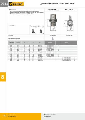 H H OOGGSSSS Держатели метчиков "SOFT SYNCHRO” Информация: POLYGONAL WELDON · Для станков с синхронизированной функцией «rigid tapping» · Маленькая осевая компенсация: 0,2мм на сжатие, 1мм на растяжение · Максимально допустимое давление СОЖ - 50bar Аксессуары Адаптеры Цанги 191 192 D D A A A ER Стандарт ISO 26623-1 DIN 1835 B+E Внутреннее охлаждение Хвостовик Адаптер D A H M INDEX INDEX C40 A20 20 43 55 M3-M12 R-OGSS-C40/A20 C40 A32 32 60 75 M6-M20 R-OGSS-C40/A32 C50 A20 20 43 55 M3-M12 R-OGSS-C50/A20 C50 A32 32 60 75 M6-M20 R-OGSS-C50/A32 C63 A20 20 43 58 M3-M12 R-OGSS-C63/A20 C63 A32 32 60 78 M6-M20 R-OGSS-C63/A32 C63 A50 50 87 102 M14-M33 R-OGSS-C63/A50 C80 A20 20 43 66 M3-M12 R-OGSS-C80/A20 C80 A32 32 60 86 M6-M20 R-OGSS-C80/A32 C80 A50 50 87 116 M14-M33 R-OGSS-C80/A50 OGN W25W25 A20A32 20 43 34 M3-M12326056M6-M20 R-OGSS-W25/A20R-OGSS-W25/A32 W40 A50 50 87 87 M14-M33 R-OGSS-W40/A50 118822 Пример заказаR-OGSS-C63/A20 Доступнo со складаПо запросу 8