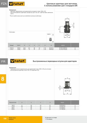 HH h FZA Цанговые адаптеры для метчиков, С использованием цанг стандарта ER Информация: · Адаптеры предназначены для держателей инструмента типов OGK и OG · IПри использовании в адаптерах стандартных цанг типа ER - адаптер имеет крепежные винты *После каждой смены метчика необходимо затянуть адаптеры. d Аксессуары Цанги 192 D A ER Размер Цанга H h A d D M INDEX FZA19 ER16 29,5 8,5 28 19 2-10 M3-M12 R-FZA19/ER16 FZA31 ER25 38,5 15 42 31 2-16 M6-M20 R-FZA31/ER25 FFRR Быстросменные переходные втулки для адаптеров FZA Информация: · Переходные втулки предназначены для держателей типов OGK и OG для установки в быстросменные адаптеры типов FZS, FZ и адаптеры FZA d D A Редукционные H A d D INDEX 19/13 6 30 19 13 R-FR19/13 31/19 8,5 46 31 19 R-FR31/19 48/31 7 68 48 31 R-FR48/31 60/48 13 92 60 48 R-FR60/48 119900 Пример заказаR-FR19/13 Доступнo со складаПо запросу 8