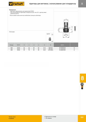 H h Адаптеры для метчиков, с использование цанг стандарта eр A Информация: · Адаптеры предназначены для держателей OGSS · При использовании в адаптерах стандартных цанг типа ER - адаптер имеет крепежные винты *После каждой смены метчика необходимо затянуть адаптеры. d Аксессуары Цанги 192 D A ER Размер Цанга H h A d D M INDEX A20 ER16 24 42 28 20 2-10 M3-M12 R-A20/ER16 A32 ER25 28 59 42 32 2-16 M6-M20 R-A32/ER25 A50 ER40 32 75 63 50 6-26 M14-M33 R-A50/ER40 Пример заказа Доступнo со склада 191 R-A20/ER16 По запросу 8