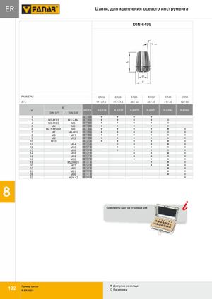 L ER Цанги, для крепления осевого инструмента ER DIN-6499 o 8 D d РАЗМЕРЫ ER16 ER20 ER25 ER32 ER40 ER50 d/L 17 / 27,5 21 / 31,5 26 / 34 33 / 40 41 / 46 52 / 60 M D INDEX R-ER16 R-ER20 R-ER25 R-ER32 R-ER40 R-ER50 DIN 371 DIN 376 2 D2 3 M2-M2,5 M3,5-M4 D3 4 M3-M3,5 M5 D4 5 M4 M6 D5 6 M4,5-M5-M6 M8 D6 7 M7 M9-M10 D7 8 M8 M11 D8 9 M9 M12 D9 10 M10 D10 11 M14 D11 12 M16 D12 13 M16 D13 14 M18 D14 15 M18 D15 16 M20 D16 18 M22-M24 D18 20 M27 D20 22 M30 D22 25 M33 D25 28 M36 D28 32 M39-42 D32 Комплекты цанг на странице 209 119922 Пример заказаR-ER25/D3 Доступнo со складаПо запросу 8