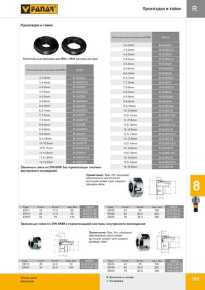 Прокладки и гайки R Прокладки и гайки Уплотнительные прокладки для ER25 INDEX 3-3.5mm R-U25/D3 3.5-4mm R-U25/D3,5 4-4.5mm R-U25/D4 Уплотнтельные прокладки для ER40 и ER50 доступны на заказ 4.5-5mm R-U25/D4,5 5-5.5mm R-U25/D5 5.5-6mm R-U25/D5,5 Уплотнительные прокладки для ER20 INDEX 6-6.5mm R-U25/D6 3-3.5mm R-U20/D3 6.5-7mm R-U25/D6,5 3.5-4mm R-U20/D3,5 7-7.5mm R-U25/D7 4-4.5mm R-U20/D4 7.5-8mm R-U25/D7,5 4.5-5mm R-U20/D4,5 8-8.5mm R-U25/D8 5-5.5mm R-U20/D5 8.5-9mm R-U25/D8,5 5.5-6mm R-U20/D5,5 9-9.5mm R-U25/D9 6-6.5mm R-U20/D6 9.5-10mm R-U25/D9,5 6.5-7mm R-U20/D6,5 10-10.5mm R-U25/D10 7-7.5mm R-U20/D7 10.5-11mm R-U25/D10,5 7.5-8mm R-U20/D7,5 11-11.5mm R-U25/D11 8-8.5mm R-U20/D8 11.5-12mm R-U25/D11,5 8.5-9mm R-U20/D8,5 12-12.5mm R-U25/D12 9-9.5mm R-U20/D9 12.5-13mm R-U25/D12,5 9.5-10mm R-U20/D9,5 13-13.5mm R-U25/D13 10-10.5mm R-U20/D10 13.5-14mm R-U25/D13,5 10.5-11mm R-U20/D10,5 14-14.5mm R-U25/D14 11-11.5mm R-U20/D11 14.5-15mm R-U25/D14,5 11.5-12mm R-U20/D11,5 15-15.5mm R-U25/D15 12-12.5mm R-U20/D12 15.5-16mm R-U25/D15,5 Зажимные гайки по DIN 6499 без герметизации системы 16-16.5mm R-U25/D16 внутреннего охлаждения Примечание: Max. Nm указывает максимально допустимый крутящий момент для каждого размера гайки Type A mm B mm max. Nm INDEX Type A mm B mm max. Nm INDEX ER11 19 11,3 30 R-NT11-SE ER25 42 20 130 R-NT25-S ER16 28 17,5 70 R-NT16-SE ER40 63 25,5 220 R-NT40-S ER20 34 19 100 R-NT20-SE ER50 78 35,3 300 R-NT50-S Зажимные гайки по DIN 6499 с герметизацией системы внутреннего охлаждения Примечание: Max. Nm указывает максимально допустимый крутящий момент для каждого размера гайки Type A mm B mm max. Nm INDEX Type A mm B mm max. Nm INDEX ER16 28 22,5 70 R-NTU16-SE ER25 42 25 130 R-NTU25-S ER20 34 24,5 100 R-NTU20-SE ER40 63 30,5 220 R-NTU40-S ER50 78 42,5 300 R-NTU50-S Пример заказа Доступнo со склада 195 R-NTU16-SE По запросу 8