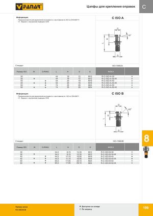 LL HH Цапфы для крепления оправок C Информация: C ISO A · Предназначаются для держателей инструмента с хвостовиком по ISO по DIN-698711 · IK - Вариант с внутренним подводом СОЖ D 15o G Стандарт ISO-7388/2A Размер ISO IK O-RING L H D G INDEX 30 44 19 12 M12 R-C-ISO-A-30 30 44 19 12 M12 R-C-ISO-A-30-IK 40 54 20 19 M16 R-C-ISO-A-40 40 54 20 19 M16 R-C-ISO-A-40-IK 50 74 25 28 M24 R-C-ISO-A-50 50 74 25 28 M24 R-C-ISO-A-50-IK Информация: C ISO B · Предназначаются для держателей инструмента с хвостовиком по ISO по DIN-69871 · IK - Вариант с внутренним подводом СОЖ D 45o G Стандарт ISO-7388/2B Размер ISO IK O-RING L H D G INDEX 30 34,0 8,15 13,35 M12 R-C-ISO-B-30 30 34,0 8,15 13,35 M12 R-C-ISO-B-30-IK 40 44,5 11,15 18,95 M16 R-C-ISO-B-40 40 44,5 11,15 18,95 M16 R-C-ISO-B-40-IK 50 65,5 17,95 29,10 M24 R-C-ISO-B-50 50 65,5 17,95 29,10 M24 R-C-ISO-B-50-IK Пример заказа Доступнo со склада 199 R-C-ISO-B-30 По запросу 8