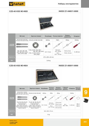 Наборы инструментов CZD-40 HSS M3÷M20 INDEX Z1-040011-0000 Плашко- Метчики Круглые плашки Резьбомер Ручные воротки держатели Отвертка DIN-352 HSS dla M3÷M12DIN-352/2 HSS dla M14÷M20DIN-EN 22 568 HSS 800MWGa PBPc PBGa RWWe СОСТАВ НАБОРА Ć25 x 9:M3 | M4 | M5 | Nr 2 zm.: M3 | M4 | M5 | M6| M7, M8, M10 | M12M6 | M7 | M8 | M10 0,4 ÷ 6 mm 2,5 ÷ 9 mm Ć25 x 9 mm 4 x 90 mm | M14 | M16 | M20 Ć38 x 14: M12 | M14 | Nr 3: Ć38 x 14 mm M16 | M20 4,9 ÷ 14 mm ГАБАРИТЫ 475 x 255 x 40 mm ВЕС 3,40 kg CZD-85 HSS M3÷M24 INDEX Z1-085011-0000 Метчики РучныеКруглые плашкиРезьбомерПлашко-Т-образныйметчико-ОтверткаКольцо-вороткидержателидержательвставка DIN-352 HSS - M3÷M12DIN-352/2 HSS - M14÷M24DIN-EN 22 568 HSS 800MWGa PBPc PBGa RWWe 9 DIN-2181/2 HSS - MFł14x1,25 СОСТАВ НАБОРА M3, M4, M5, M6, M8, M10, M3 | M4 | M5 | M6 | M8 | M10M12, M14, M16, M18,M12 | M14 | M16 | M18Nr 2 zm.:Ć25 x 9 mm M20, M22, M24, M20 | M22 | M24 2,5 ÷ 9 mm Ć38 x 14 mm Nr 1 38 x 2 M8x1, M10x1, M12x1,25, M8x1 | M10x1 | M12x1,25 0,4 ÷ 6 mmM12x1,5, M14x1,25, M14x1,5,M12x1,5 | M14x1,25 | M14x1,5Nr 3:Ć45 x 18 mm(M2 ÷ M5)4 x 90 mm45 x 255 x 3 M16x1,5,M18x1,5, M20x1,5, M16x1,5 | M18x1,5 | M20x1,5M22x1,5, M24x1,5M22x1,5 | M24x1,54,9 ÷ 14 mmĆ55 x 22 mm ГАБАРИТЫ 550 x 380 x 70 mm ВЕС 12 kg Пример заказа Z1-040011-0000 203 CZD-40 HSS