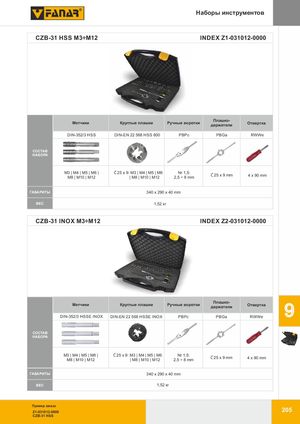 Наборы инструментов CZB-31 HSS M3÷M12 INDEX Z1-031012-0000 Плашко- Метчики Круглые плашки Ручные воротки держатели Отвертка DIN-352/3 HSS DIN-EN 22 568 HSS 800 PBPc PBGa RWWe СОСТАВ НАБОРА M3 | M4 | M5 | M6 | Ć25 x 9: M3 | M4 | M5 | M6 Nr 1,5: M8 | M10 | M12 | M8 | M10 | M12 2,5 ÷ 8 mm Ć25 x 9 mm 4 x 90 mm ГАБАРИТЫ 340 x 290 x 40 mm CIВĘЕŻСARWEIGHT 1,52 кг CZB-31 INOX M3÷M12 INDEX Z2-031012-0000 Плашко- Метчики Круглые плашки Ручные воротки держатели ОтверткаDIN-352/3 HSSE INOXDIN-EN 22 568 HSSE INOXPBPcPBGaRWWe9 СОСТАВ НАБОРА M3 | M4 | M5 | M6 | Ć25 x 9: M3 | M4 | M5 | M6 Nr 1,5: M8 | M10 | M12 | M8 | M10 | M12 2,5 ÷ 8 mm Ć25 x 9 mm 4 x 90 mm ГАБАРИТЫ 340 x 290 x 40 mm ВЕС 1,52 кг Пример заказа Z1-031012-0000 205 CZB-31 HSS