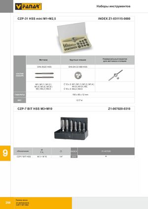 Наборы инструментов CZP-31 HSS mini M1÷M2,5 INDEX Z1-031115-0000 Универсальный вороток Метчики Круглые плашки для метчиков и плашек DIN-352/2 HSS DIN-EN 22 568 HSS СОСТАВ НАБОРА M1 | M1,1 | M1,2 | Ć12 x 3: M1 | M1,1 | M1,2 | M1,4 | M1,4 | M1,6 | M1,8 | M1,6 | M1,8 | M2, M2 | M2,2 | M2,5 Ć16 x 3: M2,2 | M2,5 ГАБАРИТЫ 155 x 85 x 12 mm ВЕС 0,17 кг 5 CZP-7 BIT HSS M3÷M10 Z1-007020-0310 M 9 обозначения Ćd1 INDEX Z1-007020 CZP-7 BIT HSS M 3 ÷ M 10 1/4” 0310 Пример заказа 206 Z1-007020-0310 CZP-7 BIT HSS