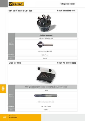 НаборНыабионрсытрзуемнеконвтоовк CZCPZ-B6-D31INH-3S3S5-C Ø6,3 ÷ Ø25 INDEX Z12-036150125-0000 Набор зенковок DIN-335-C HSSE Co8 TiCN СОСТАВ НАБОРА 6,3 | 10,4 | 16,5 | 20,5 | 25 ГАБАРИТЫ 125 x 75 mm CIВĘЕŻСAR5WEIGHT 0,20 кг WDG M3÷M12 INDEX W9-900002-0000 Наборы сверл для извлечения сломанных метчиков 9 WDG СОСТАВ НАБОРА M3 | M4 | M5 | M6 | M8 | M10 | M12 ГАБАРИТЫ 290 x 340 x 40 mm ВЕС 1,225 кг Пример заказа 208 Z1-031012-0000
