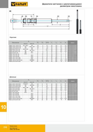 Держатели метчиков с увеличивающимся диаметром хвостовика IK Короткие D 1 Обозначение D D D =D L L a a23451212 INDEX DIN-371 DIN-376 PBNm 2,8/2,1-6/4,9-130 M2 - M2,6 M4 2,8 6 6,1 22 130 2,1 4,9 V0-211135-0206 PBNm 3,5/2,7-6/4,9-130 M3 M4,5 - M5 3,5 6 7,5 23 130 2,7 4,9 V0-211135-0306 PBNm 4,5/3,4-6/4,9-130 M4 M6 4,5 6 8,4 23 130 3,4 4,9 V0-211135-0406 PBNm 6/4,9-7/5,5-130 M4,5 - M6 M8 6 7 12,1 26 130 4,9 5,5 V0-211135-0607 PBNm 7/5,5-7/5,5-130 M7 M9 - M10 7 7 12,1 26 130 5,5 5,5 V0-211135-0707 PBNm 8/6,2-8/6,2-130 M8 M11 8 8 13 30 130 6,2 6,2 V0-211135-0808 PBNm 9/7-9/7-130 M9 M12 9 9 15 31 130 7 7 V0-211135-0909 PBNm 10/8-10/8-130 M10 - 10 10 15 33 130 8 8 V0-211135-1010 PBNm 11/9-11/9-130 M14 11 11 18 36 130 9 9 V0-211135-1111 PBNm 12/9-12/9-200 M16 12 12 18 36 130 9 9 V0-211135-1212 PBNm 14/11-14/11-200 M18 14 14 22 42 200 11 11 V0-211205-1414 PBNm 16/12-16/12-200 M20 16 16 22 42 200 12 12 V0-211205-1616 PBNm 18/14,5-18/14,5-200 M22/M24 18 18 26 43 200 14,5 14,5 V0-211205-1818 PBNm 20/16-20/16-200 M27 20 20 28 48 200 16 16 V0-211205-2020 Длинные D1 Обозначение D2 D3 D4=D5 L1 L2 a1 a2 INDEX DIN-371 DIN-376 PBNm 2,8/2,1-6/4,9-230 M2-M2,6 M4 2,8 6 6,1 22 130 2,1 4,9 V0-211235-0206 PBNm 3,5/2,7-6/4,9-230 M3 M4,5-M5 3,5 6 7,5 23 130 2,7 4,9 V0-211235-0306 PBNm 4,5/3,4-6/4,9-230 M4 M6 4,5 6 8,4 23 130 3,4 4,9 V0-211235-0406 PBNm 6/4,9-7/5,5-230 M4,5 - M6 M8 6 7 12,1 26 230 4,9 5,5 V0-211235-0607 PBNm 7/5,5-7/5,5-230 M7 M9 - M10 7 7 12,1 26 230 5,5 5,5 V0-211235-0707 PBNm 8/6,2-8/6,2-230 M8 M11 8 8 13 30 230 6,2 6,2 V0-211235-0808 PBNm 9/7-9/7-230 M9 M12 9 9 15 31 230 7 7 V0-211235-0909 PBNm 10/8-10/8-230 M10 - 10 10 15 33 230 8 8 V0-211235-1010 PBNm 11/9-11/9-230 M14 11 11 18 36 230 9 9 V0-211235-1112 PBNm 12/9-12/9-230 M16 12 12 18 36 230 9 9 V0-211235-1212 PBNm 14/11-14/11-330 M18 14 14 22 42 330 11 11 V0-211335-1414 PBNm 16/12-16/12-330 M20 16 16 22 42 330 12 12 V0-211335-1616 PBNm 18/14,5-18/14,5-330 M22/M24 18 18 26 43 330 14,5 14,5 V0-211335-1818 PBNm 20/16-20/16-330 M27 20 20 28 48 330 16 16 V0-211335-2020 10 Пример заказа 216 V0-211230-1212 PBNm 12/9-12/9-230