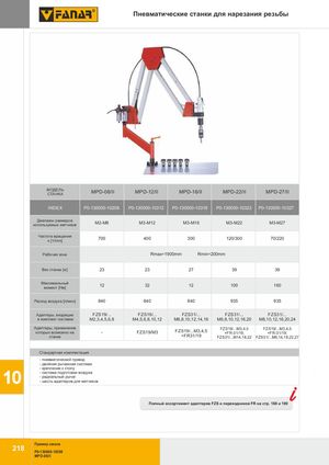 Пневматические станки для нарезания резьбы МОДЕЛЬСТАНКА MPD-08/II MPD-12/II MPD-16/II MPD-22/II MPD-27/II INDEX P0-130000-10208 P0-130000-10312 P0-130000-10316 P0-130000-10322 P0-130000-10327 Диапазон размеровиспользуемых метчиковM2-M8 M3-M12 M3-M16 M3-M22 M3-M27 Частота вращенияn [1/min] 700 400 300 120/300 70/220 Рабочая зона Rmax=1900mm Rmin=200mm Вес станкa [кг] 23 23 27 39 39 Максимальныймомент [Нм] 12 32 12 100 160 Расход воздуха [л/мин] 840 840 840 935 935 Адаптеры, входящие FZS19/... FZS19/... FZS31/... FZS31/... FZS31/... в комплект поставки M2,3,4,5,6,8 M4,5,6,8,10,12 M6,8,10,12,14,16 M6,8,10,12,16,20 M8,10,12,16,20,24 Адаптеры, применениекоторых возможно на- FZS19/M3 FZS19/...M3,4,5 FZS19/...M3,4,5+FR-31/19;FZS19/...M3,4,5+FR-31/19; станке +FR31/19 FZS31/...M14,18,22 FZS31/...M6,14,18,22,27 Стандартная комплектация - пневматический привод - двойная рычажная система - крепление к столу- система подготовки воздуха10- радиальный рычаг- шесть адаптеров для метчиков 8 Полный ассортимент адаптеров FZS и переходников FR на стр. 188 и 190 Пример заказа 218 P0-130000-10208 MPD-08/II