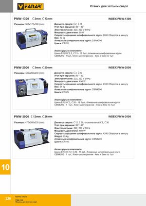 Станки для заточки сверл PMW-1300 Ć2mm¸Ć13mm INDEX PMW-1300 Размеры: 305x172x180 (mm) Диаметр сверла: Ć2¸Ć13 Угол при вершине: 85o-140o Электропитание: 220¸230 V 50Hz Мощность двигателя: 90 W Скорость вращения шлифовального круга: 6000 Оборотов в минуту Вес: 10 kg Алмазные шлифовальные круги: CBN#200 Цанги: ER-20 Аксессуары в комплекте: Цанги ER20 Ć2,5¸Ć13 - 12 1шт., Алмазные шлифовальные круги CBN#200 - 11шт., Ключ-шестигранник - 4мм и 6мм по 1шт PMW-2000 Ć3mm¸Ć20mm INDEX PMW-2000 Размеры: 480x260x240 (mm) Диаметр сверла: Ć3¸Ć20 Угол при вершине: 85o-140o Электропитание: 220¸230 V 50Hz Мощность двигателя: 450 W Скорость вращения шлифовального круга: 4300 Оборотов в минуту Вес: 21 kg Алмазные шлифовальные круги: CBN#200 Цанги: ER-25 Аксессуары в комплекте: Цанги ER25 Ć3¸Ć20 - 18 1шт., Алмазные шлифовальные круги CBN#200 - 1 1шт., Ключ-шестигранник - 4мм и 6мм по 1шт PMW-3000 Ć12mm¸Ć26mm INDEX PMW-3000 Размеры: 470x260x235 (mm) Диаметр сверла: Ć12¸Ć26, опциональный Ć8¸Ć30 Угол при вершине: 85o-140o Электропитание: 220¸230 V 50Hz Мощность двигателя: 450 W Скорость вращения шлифовального круга: 4300 Оборотов в минуту Weight: 25 kg Алмазные шлифовальные круги: CBN#200 Цанги: ER-40 Аксессуары в комплекте: Цанги ER40 Ć12¸Ć26 - 15 szt., Алмазные шлифовальные круги CBN#200 - 1 шт., Ключ-шестигранник - 4мм и 6мм по 1шт 10 Пример заказа 220 PMW-1300 Машины для заточки сверл
