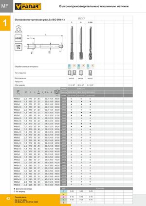 d1 d2 a MF Высокопроизводительные машинные метчики MF Основная метрическая резьба ISO DIN-13 800 1 HS6S0E0 C B C-R40 P PM l1 HSSE l2 DIN 374 P M K P M K P M K Обрабатываемые материалы N S H N S H N S H Тип отверстия < 1.5d < 3d < 2,5d Изготовлен из HSSE HSSE HSSE Покрытие Сбег резьбы C / 2-3P B / 4-5P C / 2-3P Норма DIN-374 MFĆd PToleral1ncja l2 l2R40l 3 Ć d2 a Точность ISO2 (6H) ISO2 (6H) ISO2 (6H) 1 INDEX D2-121101 D2-111101 D2-511101 M28x2 2,0 140 27 20 - 20,0 16,0 26,00 0286 M30x1,5 1,5 150 27 22 - 22,0 18,0 28,50 0305 M30x2 2,0 150 27 22 - 22,0 18,0 28,00 0306 M32x1,5 1,5 150 27 22 - 22,0 18,0 30,50 0325 M32x2 2,0 150 27 22 - 22,0 18,0 30,00 0326 M33x1,5 1,5 160 30 22 - 25,0 20,0 31,50 0335 M33x2 2,0 160 30 24 - 25,0 20,0 31,00 0336 Tolerancja M34x1,5 1,5 170 30 22 - 28,0 22,0 32,50 0345 M35x1,5 1,5 170 30 22 - 28,0 22,0 33,50 0355 M36x1,5 1,5 170 30 22 - 28,0 22,0 34,50 0365 M36x2 2,0 170 30 24 - 28,0 22,0 34,00 0366 M36x3 3,0 200 50 30 - 28,0 22,0 33,00 0367 M38x1,5 1,5 170 30 24 - 28,0 22,0 36,50 0385 M39x1,5 1,5 170 30 25 - 32,0 24,0 37,50 0395 M39x2 2,0 170 30 25 - 32,0 24,0 37,00 0396 M39x3 3,0 200 50 30 - 32,0 24,0 36,00 0397 M40x1,5 1,5 170 30 25 - 32,0 24,0 38,50 0405 M40x2 2,0 170 30 25 - 32,0 24,0 38,00 0406 M42x1,5 1,5 170 30 25 - 32,0 24,0 40,50 0425 M42x2 2,0 170 30 25 - 32,0 24,0 40,00 0426 M42x3 3,0 200 50 30 - 32,0 24,0 39,00 0427 M45x1,5 1,5 180 30 27 - 36,0 29,0 43,50 0455 M45x2 2,0 180 30 27 - 36,0 29,0 43,00 0456 M45x3 3,0 200 50 30 - 36,0 29,0 42,00 0457 M48x1,5 1,5 190 30 27 - 36,0 29,0 46,50 0485 M48x2 2,0 190 30 27 - 36,0 29,0 46,00 0486 M48x3 3,0 225 50 33 - 36,0 29,0 45,00 0487 M50x1,5 1,5 190 30 27 - 36,0 29,0 48,50 0505 M50x2 2,0 190 30 33 - 36,0 29,0 48,00 0506 M52x1,5 1,5 190 32 27 - 40,0 32,0 50,50 0525 M52x2 2,0 190 32 33 - 40,0 32,0 50,00 0526 M52x3 3,0 225 50 33 - 40,0 32,0 49,00 0527 Доступнo со склада ISO Vc (m/min) По запросу P 5-20 5-20 5-20 M - - - Пример заказа K 5-15 5-15 5-15 42 D2-121101-0286 N 5-25 5-25 5-25 800 M28x2-6H DIN-374 C HSSE S - - -
