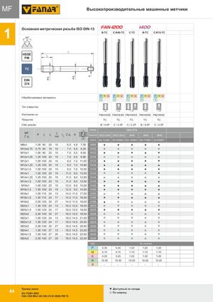 d1 d2 a MF Высокопроизводительные машинные метчики MF Основная метрическая резьба ISO DIN-13 FAN-1200 1400 1 HS6S0E0 B-TC C-R40-TC C-TC B-TC C-R15-TC P PM l1 HSSE l2 PM TC DIN 374 P M K P M K P M K P M K P M K Обрабатываемые материалы N S H N S H N S H N S H N S H Тип отверстия < 3d < 2,5d < 1,5d < 2,5d < 1,5d Изготовлен из PM/HSSE PM/HSSE PM/HSSE PM/HSSE PM/HSSE Покрытие TC TC TC TC TC Сбег резьбы B / 4-5P C / 2-3P C / 2-3P B / 4-5P C / 2-3P Норма DIN-374 MFĆd PToleral1ncja l2 l2R40l 3 Ć d2 a Точность ISO2 (6H) ISO2 (6H) 6HX 6HX 6HX 1 INDEX D4-115001 D4-565001 D4-125901 D4-115901 D4-505901 M8x1 1,00 90 20 10 - 6,0 4,9 7,00 0083 M10x0,75 0,75 90 18 10 - 7,0 5,5 9,20 0102 M10x1 1,00 90 20 10 - 7,0 5,5 9,00 0103 M10x1,25 1,25 100 20 15 - 7,0 5,5 8,80 0104 M12x1 1,00 100 20 10 - 9,0 7,0 11,00 0123 M12x1,25 1,25 100 20 15 - 9,0 7,0 10,80 0124 M12x1,5 1,50 100 20 15 - 9,0 7,0 10,50 0125 Tolerancja M14x1 1,00 100 20 10 - 11,0 9,0 13,00 0143 M14x1,25 1,25 100 20 15 - 11,0 9,0 12,80 0144 M14x1,5 1,50 100 20 15 - 11,0 9,0 12,50 0145 M16x1 1,00 100 20 10 - 12,0 9,0 15,00 0163 M16x1,5 1,50 100 20 15 - 12,0 9,0 14,50 0165 M18x1 1,00 110 24 13 - 14,0 11,0 17,00 0183 M18x1,5 1,50 110 24 17 - 14,0 11,0 16,50 0185 M18x2 2,00 125 32 27 - 14,0 11,0 16,00 0186 M20x1 1,00 125 24 13 - 16,0 12,0 19,00 0203 M20x1,5 1,50 125 24 17 - 16,0 12,0 18,50 0205 M20x2 2,00 140 32 27 - 16,0 12,0 18,00 0206 M22x1 1,00 125 24 13 - 18,0 14,5 21,00 0223 M22x1,5 1,50 125 24 17 - 18,0 14,5 20,50 0225 M22x2 2,00 140 32 27 - 18,0 14,5 20,00 0226 M24x1 1,00 140 27 13 - 18,0 14,5 23,00 0243 M24x1,5 1,50 140 27 20 - 18,0 14,5 22,50 0245 M24x2 2,00 140 27 20 - 18,0 14,5 22,00 0246 ISO Vc (m/min) P 5-35 5-35 1-20 1-20 1-20 M 5-15 5-15 1-10 1-10 1-10 K 5-25 5-25 1-20 1-20 1-20 N 10-30 10-30 10-20 10-20 10-20 S - - - - - Пример заказа Доступный со склада 44 D4-115001-0083 По запросу FAN-1200 M8x1-6H DIN-374 B HSSE-PM TC