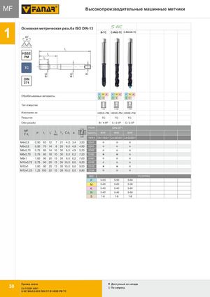 d1 d2 a MF Высокопроизводительные машинные метчики Основная метрическая резьба ISO DIN-13 S-NC 1 HS6S0E0 B-TC C-R45-TC C-R45-IK-TC P PM l1 HSSE l3 PM l2 TC DIN 371 P M K P M K P M K Обрабатываемые материалы N S H N S H N S H Тип отверстия < 3d < 2,5d < 2,5d Изготовлен из HSSE-PM HSSE-PM HSSE-PM Покрытие TC TC TC Сбег резьбы B / 4-5P C / 2-3P C / 2-3P Норма DIN-371 MFĆd1 PToleral1ncja l2 l2R45 l 3 Ć d2 a Точность 6HX 6HX 6HX INDEX C4-115301 C4-525301 C4-525351 M4x0,5 0,50 63 12 7 21 4,5 3,4 3,50 0041 M5x0,5 0,50 70 14 8 25 6,0 4,9 4,50 0051 M6x0,75 0,75 80 14 10 30 6,0 4,9 5,20 0062 M8x0,75 0,75 80 18 10 30 8,0 6,2 7,20 0082 M8x1 1,00 90 20 13 35 8,0 6,2 7,00 0083 M10x0,75 0,75 90 20 13 35 10,0 8,0 9,20 0102 M10x1 1,00 90 20 13 35 10,0 8,0 9,00 0103 Tolerancja M10x1,25 1,25 100 20 15 39 10,0 8,0 8,80 0104 ISO Vc (m/min) P 5-50 5-50 5-60 M 5-20 5-20 5-30 K 5-40 5-40 5-60 N 5-40 5-40 5-60 S 1-8 1-8 1-8 Пример заказа Доступный со склада 50 C4-115301-0041 По запросу S-NC M4x0,5-6HX DIN-371 B HSSE-PM TC