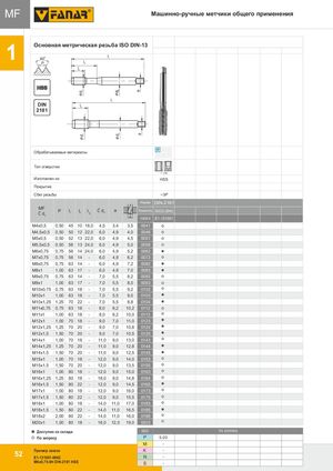 d1 d1 d2d2 aa MF Машинно-ручные метчики общего применения Основная метрическая резьба ISO DIN-13 1 HS6S0E0P l1l3 PM l2 HSS l1 DIN l2 2181 P M K Обрабатываемые материалы N S H Тип отверстия < 1,5d Изготовлен из HSS Покрытие Сбег резьбы ~3P Норма DIN-2181 MF Ćd PToleral1ncja l2 l 3 Ć d2 a Точность ISO2 (6H) 1 INDEX E1-131001 M4x0,5 0,50 45 10 18,0 4,5 3,4 3,5 0041 M4,5x0,5 0,50 50 12 22,0 6,0 4,9 4,0 0046 M5x0,5 0,50 52 13 22,0 6,0 4,9 4,5 0051 M5,5x0,5 0,50 56 13 24,0 6,0 4,9 5,0 0056 M6x0,75 0,75 56 14 24,0 6,0 4,9 5,2 0062 M7x0,75 0,75 56 14 - 6,0 4,9 6,2 0072 M8x0,75 0,75 63 14 - 6,0 4,9 7,2 0082 Tolerancja M8x1 1,00 63 17 - 6,0 4,9 7,0 0083 M9x0,75 0,75 63 14 - 7,0 5,5 8,2 0092 M9x1 1,00 63 17 - 7,0 5,5 8,0 0093 M10x0,75 0,75 63 18 - 7,0 5,5 9,2 0102 M10x1 1,00 63 18 - 7,0 5,5 9,0 0103 M10x1,25 1,25 70 22 - 7,0 5,5 8,8 0104 M11x0,75 0,75 63 18 - 8,0 6,2 10,2 0112 M11x1 1,00 63 18 - 8,0 6,2 10,0 0113 M12x1 1,00 70 18 - 9,0 7,0 11,0 0123 M12x1,25 1,25 70 20 - 9,0 7,0 10,8 0124 M12x1,5 1,50 70 20 - 9,0 7,0 10,5 0125 M14x1 1,00 70 18 - 11,0 9,0 13,0 0143 M14x1,25 1,25 70 20 - 11,0 9,0 12,8 0144 M14x1,5 1,50 70 20 - 11,0 9,0 12,5 0145 M15x1 1,00 70 18 - 12,0 9,0 14,0 0153 M15x1,5 1,50 70 20 - 12,0 9,0 13,5 0155 M16x1 1,00 80 18 - 12,0 9,0 15,0 0163 M16x1,25 1,25 80 18 - 18,0 9,0 14,8 0164 M16x1,5 1,50 80 22 - 12,0 9,0 14,5 0165 M17x1 1,00 80 18 - 12,0 9,0 16,0 0173 M17x1,5 1,50 80 22 - 12,0 9,0 15,5 0175 M18x1 1,00 80 18 - 14,0 11,0 17,0 0183 M18x1,5 1,50 80 22 - 14,0 11,0 16,5 0185 M18x2 2,00 80 22 - 14,0 11,0 16,0 0186 M20x1 1,00 80 18 - 16,0 12,0 19,0 0203 Доступнo со склада ISO Vc (m/min) По запросу P 5-20 M - Пример заказа K - 52 E1-131001-0062 N - M6x0,75-6H DIN-2181 HSS S -