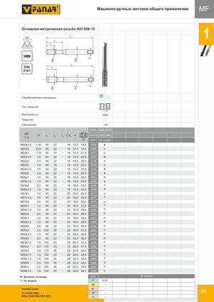 d1d1 d2d2 aa MF Машинно-ручные метчики общего применения MF Основная метрическая резьба ISO DIN-13 HS6S0E0 l1 1 PPM l3l2 HSS l1 DIN l2 2181 P M K Обрабатываемые материалы N S H Тип отверстия < 1,5d Изготовлен из HSS Покрытие Сбег резьбы ~3P Норма DIN-2181 MFĆd PToleranlc1ja l2 l 3 Ć d2 a Точность ISO2 (6H) 1 INDEX E1-131001 M20x1,5 1,50 80 22 - 16 12,0 18,5 0205 M20x2 2,00 80 22 - 16 12,0 18,0 0206 M22x1 1,00 80 18 - 18 14,5 21,0 0223 M22x1,5 1,5 80 22 - 18 14,5 20,5 0225 M22x2 2,0 80 22 - 18 14,5 20,0 0226 M24x1 1,0 90 18 - 18 14,5 23,0 0243 M24x1,5 1,5 90 22 - 18 14,5 22,5 0245 Tolerancja M24x2 2,0 90 22 - 18 14,5 22,0 0246 M25x1 1,0 90 18 - 18 14,5 24,0 0253 M25x1,5 1,5 90 22 - 18 14,5 23,5 0255 M25x2 2,0 90 22 - 18 14,5 23,0 0256 M26x1,5 1,5 90 22 - 18 14,5 24,5 0265 M27x1 1,0 90 20 - 20 16,0 26,0 0273 M27x1,5 1,5 90 22 - 20 16,0 25,5 0275 M27x2 2,0 90 22 - 20 16,0 25,0 0276 M28x1 1,0 90 20 - 20 16,0 27,0 0283 M28x1,5 1,5 90 22 - 20 16,0 26,5 0285 M28x2 2,0 90 22 - 20 16,0 26,0 0286 M30x1 1,0 90 22 - 22 18,0 29,0 0303 M30x1,5 1,5 90 22 - 22 18,0 28,5 0305 M30x2 2,0 90 22 - 22 18,0 28,0 0306 M30x3 3,0 125 36 - 22 18,0 27,0 0307 M32x1,5 1,5 90 22 - 22 18,0 30,5 0325 M32x2 2,0 90 22 - 22 18,0 30,0 0326 M33x1,5 1,5 100 25 - 25 20,0 31,5 0335 M33x2 2,0 100 25 - 25 20,0 31,0 0336 M33x3 3,0 125 36 - 25 20,0 30,0 0337 M35x1,5 1,5 100 25 - 28 22,0 33,5 0355 M36x1,5 1,5 100 25 - 28 22,0 34,5 0365 M36x2 2,0 125 36 - 28 22,0 34,0 0366 M36x3 3,0 125 36 - 28 22,0 33,0 0367 M38x1,5 1,5 100 25 - 28 22,0 36,5 0385 Доступнo со склада ISO Vc (m/min) По запросу P 5-20 M - Пример заказа K - E1-131001-0205 N - 53 M20x1,5-6H DIN-2181 HSS S -