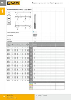 d1d1 d2d2 aa MF Машинно-ручные метчики общего применения MF Основная метрическая резьба ISO DIN-13 1 HS6S0E0 l1 PPM l3 l2 HSS l1 DIN l2 2181 P M K Обрабатываемые материалы N S H Тип отверстия < 1,5d Изготовлен из HSS Покрытие Сбег резьбы ~3P Норма DIN-2181 MFĆd PToleral1ncja l2 l 3 Ć d2 a Точность ISO2 (6H) 1 INDEX E1-131001 M39x1,5 1,5 110 25 - 32 24 37,5 0395 M39x2 2,0 125 36 - 32 24 37,0 0396 M39x3 3,0 125 36 - 32 24 36,0 0397 M40x1,5 1,5 110 25 - 32 24 38,5 0405 M40x2 2,0 125 36 - 32 24 38,0 0406 M40x3 3,0 125 36 - 36 29 37,0 0407 M42x1,5 1,5 110 25 - 36 24 40,5 0425 Tolerancja M42x2 2,0 125 36 - 36 24 40,0 0426 M42x3 3,0 125 36 - 36 24 39,0 0427 M42x4 4,0 150 50 - 36 24 38,0 0428 M45x1,5 1,5 110 25 - 36 29 43,5 0455 M45x2 2,0 125 36 - 36 29 43,0 0456 M45x3 3,0 125 36 - 36 29 42,0 0457 M45x4 4,0 160 50 - 36 29 41,0 0458 M48x1,5 1,5 140 30 - 36 29 46,5 0485 M48x2 2,0 140 36 - 36 29 46,0 0486 M48x3 3,0 140 36 - 40 29 45,0 0487 M48x4 4,0 180 55 - 40 29 44,0 0488 M50x1,5 1,5 140 30 - 40 29 48,5 0505 M50x2 2,0 140 36 - 40 29 48,0 0506 M50x3 3,0 140 36 - 32 29 47,0 0507 M52x1,5 1,5 140 30 - 32 32 50,5 0525 M52x2 2,0 140 36 - 32 32 50,0 0526 M52x3 3,0 140 40 - 32 32 49,0 0527 M52x4 4,0 180 55 - 32 32 48,0 0528 ISO Vc (m/min) P 5-20 M - K - N - S - Пример заказа Доступный со склада 54 E1-131001-0395 По запросу M39x1,5-6H DIN-2181 HSS