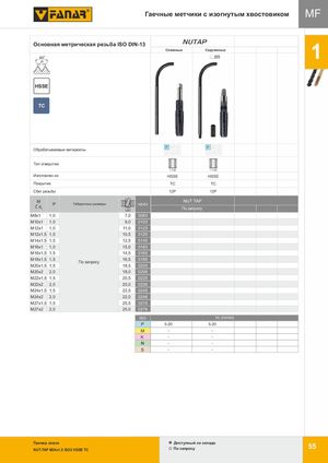 M Гаечные метчики с изогнутым хвостовиком MF Основная метрическая резьба ISO DIN-13 NUTAP HS6S0E0 Спаянные Скрученные 1 P PM HSSE TC P M K P M K Обрабатываемые материалы N S H N S H Тип отверстия < 1,5d < 1,5d Изготовлен из HSSE HSSE Покрытие TC TC Сбег резьбы 12P 12P M NUT TAP P Габаритные размеры INDEX Ćd1 Tolerancja По запросу M8x1 1,0 7,0 0083 M10x1 1,0 9,0 0103 M12x1 1,0 11,0 0123 M12x1,5 1,5 10,5 0125 M14x1,5 1,5 12,5 0145 M16x1 1,0 15,0 0163 M16x1,5 1,5 14,5 0165 M18x1,5 1,5 16,5 0185 Tolerancja По запросу M20x1,5 1,5 18,5 0205 M20x2 2,0 18,0 0206 M22x1,5 1,5 20,5 0225 M22x2 2,0 20,0 0226 M24x1,5 1,5 22,5 0245 M24x2 2,0 22,0 0246 M27x1,5 1,5 25,5 0275 M27x2 2,0 25,0 0276 ISO Vc (m/min) P 5-205-20 5-20 5-20 M - - K - - N - - S - - Пример заказа Доступный со склада NUT-TAP M24x1,5 ISO2 HSSE TC По запросу 55