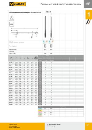 d1 d2 a Гаечные метчики с изогнутым хвостовиком MF Основная метрическая резьба ISO DIN-13 NGMf HS6S0E0 LH 1 P PM HSS l1 l2 LH P M K P M K Обрабатываемые материалы N S H N S H Тип отверстия < 1,5d < 1,5d Изготовлен из HSS HSS Покрытие Сбег резьбы 12P 12P Норма NGMf MF Ćd PToleranclj1a l2 Ć d2 a Точность ISO2 (6H) ISO2 (6H) 1 INDEX F1-151001 F1-251001 M24x1,5 1,50 250 30 18,0 14,0 22,5 0245 M24x2 2,00 250 40 18,0 14,0 22,0 0246 M25x1 1,00 250 20 20,0 16,0 24,0 0253 M25x1,5 1,50 250 30 20,0 16,0 23,5 0255 M25x2 2,00 250 40 20,0 16,0 23,0 0256 M26x1,5 1,50 250 30 20,0 16,0 24,5 0265 M27x1 1,00 250 20 20,0 16,0 26,0 0273 Tolerancja M27x1,5 1,50 250 30 20,0 16,0 25,5 0275 M27x2 2,00 250 40 20,0 16,0 25,0 0276 M28x1 1,00 250 20 22,4 18,0 27,0 0283 M28x1,5 1,50 250 30 22,4 18,0 26,5 0285 M28x2 2,00 250 40 22,4 18,0 26,0 0286 M30x1 1,00 280 20 22,4 18,0 29,0 0303 M30x1,5 1,50 280 30 22,4 18,0 28,5 0305 M30x2 2,00 280 40 22,4 18,0 28,0 0306 M30x3 3,00 280 60 22,4 18,0 27,0 0307 M32x1,5 1,50 280 30 25,0 20,0 30,5 0325 M32x2 2,00 280 40 25,0 20,0 30,0 0326 M33x1,5 1,50 280 30 25,0 20,0 31,5 0335 M33x2 2,00 280 40 25,0 20,0 31,0 0336 M33x3 3,00 280 60 25,0 20,0 30,0 0337 M35x1,5 1,50 280 30 28,0 22,4 33,5 0355 M36x1,5 1,50 280 30 28,0 22,4 34,5 0365 M36x2 2,00 280 40 28,0 22,4 34,0 0366 M36x3 3,00 280 60 28,0 22,4 33,0 0367 ISO Vc (m/min) P 5-20 5-20 M - - K 6-15 6-15 N 6-15 6-15 S - - Пример заказа Доступный со склада F1-151001-0245 По запросу 57 M24x1,5-6H NGMf HSS