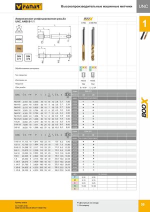 d1d1 d2d2 aa 800 Высокопроизводительные машинные метчики UNC АмеGрwиiкnаtнmскeаtrяycуzнnиyфIиSцOирDоINва-1н3ная резьба 800 UNC, ANSI B-1.1 B-TN2 C-R40-TN2600l1 1 HSSPEPM l3 l2 HSSE l1 TN2 l2 DIN DIN 371 376 P M K P M K Обрабатываемые материалы N S H N S H Тип отверстия < 3d < 2,5d Изготовлен из HSSE HSSE Покрытие TN2 TN2 Сбег резьбы B / 4-5P C / 2-3P Норма DIN-371 UNC Ć d1 1''/P P l1 l2 l2R40l 3 Ć d2 a Точность 2B 2B INDEX C2-113X01 C2-513X01 No2-56 2,184 56 0,455 45 10 10 13 2,8 2,1 1,85 4102 No4-40 2,844 40 0,635 56 10 5 18 3,5 2,7 2,35 4104 No5-40 3,175 40 0,635 56 10 7 18 3,5 2,7 2,65 4105 No6-32 3,505 32 0,794 56 12 6 20 4,0 3,0 2,85 4106 No8-32 4,165 32 0,794 63 12 7 21 4,5 3,4 3,50 4108 No10-24 4,826 24 1,058 70 14 8 25 6,0 4,9 3,90 4110 No12-24 5,486 24 1,058 80 18 10 30 6,0 4,9 4,50 4112 1/4-20 6,350 20 1,270 80 18 13 30 7,0 5,5 5,10 4127 5/16-18 7,938 18 1,411 90 20 13 35 8,0 6,0 6,60 4128 3/8-16 9,525 16 1,588 100 20 15 39 10,0 8,0 8,00 4129 Норма DIN-376 UNC Ć d1 1''/P P l1 l2 l2R40l 3 Ć d2 a Точность 2B 2B INDEX D2-113X01 D2-513X01 7/16-14 11,112 14 1,814 100 22 15 - 8,0 6,2 9,40 4130 1/2-13 12,700 13 1,954 110 24 18 - 9,0 7,0 10,80 4131 9/16-12 14,288 12 2,117 110 25 20 - 11,0 9,0 12,20 4132 5/8-11 15,875 11 2,309 110 32 22 - 12,0 9,0 13,50 4133 3/4-10 19,050 10 2,504 125 32 25 - 14,0 11,0 16,50 4135 7/8-9 22,225 9 2,822 140 32 30 - 18,0 14,5 19,50 4137 1-8 25,400 8 3,175 160 38 30 - 20,0 16,0 22,25 4139 1.1/8-7 28,575 7 3,629 180 40 40 - 22,0 18,0 25,00 4141 1.1/4-7 31,750 7 3,629 180 40 40 - 22,0 18,0 28,00 4143 1.3/8-6 34,925 6 4,233 200 50 40 - 28,0 22,0 30,75 4145 1.1/2-6 38,100 6 4,233 200 55 40 - 28,0 22,0 34,00 4147 ISO Vc (m/min) P 5-35 5-35 M 5-15 5-15 K 5-25 5-25 N 10-30 10-30 S - - Пример заказа Доступный со склада C2-113X01-4105 По запросу 59 800X No5-40 UNC 2B DIN-371 HSSE TN2