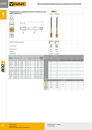 800 d1 d2 a UNEF Высокопроизводительные машинные метчики АмеGрwиiкnаtнmскeаtrяycуzнnиyфIиSцOирDоINва-1н3ная мелкая резьба 800 1 UNEF, ANSI B-1.1600 B-TN2 C-R40-TN2 HSSPE PM l1 l2 HSSE TN2 DIN ~374 P M K P M K Обрабатываемые материалы N S H N S H Тип отверстия < 3d < 2,5d Изготовлен из HSSE HSSE Покрытие TN2 TN2 Сбег резьбы B / 4-5P C / 2-3P Норма ~DIN-374 UNEF Ć d1 1''/P P l1 l2 l2R40 l 3 Ć d2 a Точность 2B 2B INDEX C2-113X01 C2-513X01 1/4-32 6,350 32 0,794 80 14 8 - 4,5 3,4 5,55 4327 5/16-32 7,938 32 0,794 80 14 8 - 6,0 4,9 7,15 4328 3/8-32 9,525 32 0,794 90 18 8 - 7,0 5,5 8,70 4329 7/16-28 11,112 28 0,907 90 18 10 - 8,0 6,2 10,20 4330 1/2-28 12,700 28 0,907 100 18 10 - 9,0 7,0 11,80 4331 9/16-24 14,288 24 1,058 100 18 11 - 11,0 9,0 13,20 4332 5/8-24 15,875 24 1,058 100 18 11 - 12,0 9,0 14,80 4333 3/4-20 19,050 20 1,270 110 25 13 - 14,0 11,0 17,80 4335 7/8-20 22,225 20 1,270 125 25 13 - 18,0 14,5 20,95 4337 1-20 25,400 20 1,270 140 28 13 - 18,0 14,5 24,15 4339 ISO Vc (m/min) P 5-35 5-35 M 5-15 5-15 K 5-25 10-25 N 10-30 10-30 S - - Пример заказа Доступный со склада 66 C2-11X01-4327 По запросу 800X 1/4-32 UNEF 2B DIN-374 B HSSE TN2