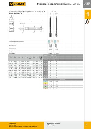 d1 d2 a UNEF Высокопроизводительные машинные метчики UNEF АмеGрwиiкnаtнmскeаtrяycуzнnиyфIиSцOирDоINва-1н3ная мелкая резьба 800 UNEF, ANSI B-1.1600 B C-R40 1 HSSPE PM l1 l2 HSSE DIN ~374 P M K P M K Обрабатываемые материалы N S H N S H Тип отверстия < 2,5d < 3d Изготовлен из HSSE HSSE Покрытие Сбег резьбы B / 4-5P C / 2-3P Норма ~DIN-374 UNEF Ć d1 1''/P P l1 l2 l2R40 l 3 Ć d2 a Точность 2B 2B INDEX C2-111101 C2-511101 1/4-32 6,350 32 0,794 80 14 8 - 4,5 3,4 5,55 4327 5/16-32 7,938 32 0,794 80 14 8 - 6,0 4,9 7,15 4328 3/8-32 9,525 32 0,794 90 18 8 - 7,0 5,5 8,70 4329 7/16-28 11,112 28 0,907 90 18 10 - 8,0 6,2 10,20 4330 1/2-28 12,700 28 0,907 100 18 10 - 9,0 7,0 11,80 4331 9/16-24 14,288 24 1,058 100 18 11 - 11,0 9,0 13,20 4332 5/8-24 15,875 24 1,058 100 18 11 - 12,0 9,0 14,80 4333 3/4-20 19,050 20 1,270 110 25 13 - 14,0 11,0 17,80 4335 7/8-20 22,225 20 1,270 125 25 13 - 18,0 14,5 20,95 4337 1-20 25,400 20 1,270 140 28 13 - 18,0 14,5 24,15 4339 ISO Vc (m/min) P 5-20 5-20 M - - K 5-15 5-15 N 5-25 5-25 S - - Пример заказа Доступный со склада C2-111101-4327 По запросу 67 Машинные метчики 800 1/4-32 UNEF 2B ~DIN-374 B HSSE