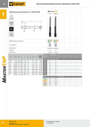 MASTERTAP d1 d2 a G Высокопроизводительные машинные метчики G ТруGбwнаinяtрmеeзьtrбyаczВnyитISвоOрDтаING-1,3DIN-ISO 228 MASTERTAP 1 550 B-HL C-R45-HL HSSPE PM l1 HSSE l2 PM HSSE PHML DIN 5156 P M K P M K Обрабатываемые материалы N S H N S H Тип отверстия < 3d < 2,5d Изготовлен из HSSE-PM HSSE-PM Покрытие HL HL Сбег резьбы B / 4-5P C / 2-3P Норма DIN-5156 G Ć d1 1''/P P l1 l2 l 3 Ć d2 a Точность INDEX D4-118M01 D4-528M01 G1/16 7,723 28 0,907 90 10 6,0 4,9 6,80 3121 G1/8 9,728 28 0,907 90 10 7,0 5,5 8,80 3123 G1/4 13,157 19 1,337 100 14 11,0 9,0 11,80 3127 G3/8 16,662 19 1,337 100 15 12,0 9,0 15,25 3129 G1/2 20,955 14 1,814 125 17 16,0 12,0 19,00 3131 G5/8 22,911 14 1,814 125 20 18,0 14,5 21,00 3133 G3/4 26,441 14 1,814 140 20 20,0 16,0 24,50 3035 G7/8 30,201 14 1,814 150 22 22,0 18,0 28,25 3137 G1 33,249 11 2,309 160 24 25,0 20,0 30,75 3139 ISO Vc (m/min) P 10-40 10-40 M 5-15 5-15 K 10-30 10-30 N 10-50 10-50 S 1-8 1-8 Пример заказа Доступный со склада 68 D4-528M01-3123 По запросу MasterTAP G-1/8'' DIN-5156 C HSSE-PM HL