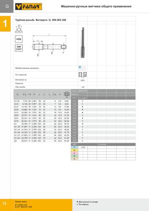 d1 d2 a G Машинно-ручные метчики общего применения ТруGбwнаinяtрmеeзьtrбyаczВnyитISвоOрDтаING-1,3DIN-ISO 228 1 550 HSSPE PM l1 HSS l2 DIN 5157 P M K Обрабатываемые материалы N S H Тип отверстия < 1,5d Изготовлен из HSS Покрытие Сбег резьбы ~3P Норма DIN-5157 G Ć d1 1''/P P l1 l2 l 3 Ć d2 a Точность INDEX E1-131001 G1/16 7,723 28 0,907 56 22 - 6 4,9 6,80 3121 G1/8 9,728 28 0,907 63 20 - 7 5,5 8,80 3123 G1/4 13,157 19 1,337 70 22 - 11 9,0 11,80 3127 G3/8 16,662 19 1,337 70 22 - 12 9,0 15,25 3129 G1/2 20,955 14 1,814 80 22 - 16 12,0 19,00 3131 G5/8 22,911 14 1,814 80 22 - 18 14,5 21,00 3133 G3/4 26,441 14 1,814 90 22 - 20 16,0 24,50 3035 G7/8 30,201 14 1,814 90 22 - 22 18,0 28,25 3137 G1 33,249 11 2,309 100 25 - 25 20,0 30,75 3139 G1.1/8 37,897 11 2,309 125 36 - 28 22,0 35,50 3141 G1.1/4 41,910 11 2,309 125 36 - 32 24,0 39,50 3143 G1.3/8 44,323 11 2,309 125 36 - 36 29,0 41,75 3145 G1.1/2 47,803 11 2,309 140 40 - 36 29,0 45,25 3147 G1.3/4 53,769 11 2,309 140 40 - 40 32,0 51,00 3151 G2 59,614 11 2,309 160 40 - 45 35,0 57,00 3155 ISO Vc (m/min) P 5-20 M - K - N - S - Пример заказа Доступный со склада 72 E1-131001-3127 По запросу G-1/4'' DIN-5157 HSS
