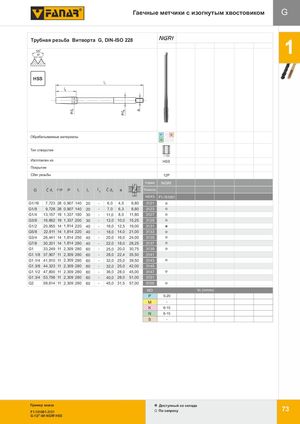 d1 d2 a Гаечные метчики с изогнутым хвостовиком G ТруGбwнаinяtрmеeзьtrбyаczВnyитISвоOрDтаING-1,3DIN-ISO 228 NGRf 550 1 HSSPE PM HSS l1 l2 P M K Обрабатываемые материалы N S H Тип отверстия < 1,5d Изготовлен из HSS Покрытие Сбег резьбы 12P Норма NGRf G Ć d1 1''/P P l1 l2 l 3 Ć d2 a Точность INDEX F1-151001 G1/16 7,723 28 0,907 140 20 - 6,0 4,5 6,80 3121 G1/8 9,728 28 0,907 140 20 - 7,0 6,3 8,80 3123 G1/4 13,157 19 1,337 180 30 - 11,0 8,0 11,80 3127 G3/8 16,662 19 1,337 200 30 - 12,0 10,0 15,25 3129 G1/2 20,955 14 1,814 220 40 - 16,0 12,5 19,00 3131 G5/8 22,911 14 1,814 220 40 - 18,0 14,0 21,00 3133 G3/4 26,441 14 1,814 250 40 - 20,0 16,0 24,00 3135 G7/8 30,201 14 1,814 280 40 - 22,0 18,0 28,25 3137 G1 33,249 11 2,309 280 60 - 25,0 20,0 30,75 3139 G1.1/8 37,907 11 2,309 280 60 - 28,0 22,4 35,50 3141 G1.1/4 41,910 11 2,309 280 60 - 32,0 25,0 39,50 3143 G1.3/8 44,323 11 2,309 280 60 - 32,0 25,0 42,00 3145 G1.1/2 47,800 11 2,309 280 60 - 36,0 28,0 45,00 3147 G1.3/4 53,756 11 2,309 280 60 - 40,0 28,0 51,00 3151 G2 59,614 11 2,309 280 60 - 45,0 31,5 57,00 3155 ISO Vc (m/min) P 5-20 M - K 6-15 N 6-15 S - Пример заказа Доступный со склада F1-151001-3131 По запросу 73 G-1/2"-6H NGRf HSS
