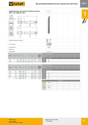 d1d1 d2d2 a a Высокопроизводительные машинные метчики NPT АмеGрwиiкnаtнmскeаtrяycкоznнyичISесOкаDяINт-р1у3бная резьба 800 NPT 1:16, ANSI B-1.20.1 C600Pl1 1 l3 1:16 l2 HSSE l1 DIN l2 ~371 DIN ~374 P M K Обрабатываемые материалы N S H Тип отверстия < 1,5d Изготовлен из HSSE Покрытие Сбег резьбы C / 2-3P Норма ~DIN-371 NPT Ć d1 1''/P P l1 l2 l 3 Ć d2 a Точность INDEX C2-121101 1/8 - 27 0,94 90 13 33 10,0 8,0 8,50 4623 1/4 - 18 11,411 100 19,5 34,5 14,0 11,0 11,10 4627 Норма ~DIN-374 Rp 1''/P P l1 l2 l 3 Ć d2 a Точность INDEX D2-121101 1/8 27 0,941 90 15 - 7 5,5 8,50 4623 3/8 18 1,411 110 22 - 14,0 11,0 14,40 4629 1/2 14 1,814 140 27 - 18,0 14,5 17,80 4643 3/4 14 1,814 140 28 - 20,0 16,0 23,15 4647 1 11.1/2 2,209 160 35 - 25,0 20,0 29,05 4655 ISO Vc (m/min) P 5-20 M - K 5-15 N 10-25 S - Пример заказа Доступный со склада C2-121101-4623 По запросу 75 800 1/8'' NPT DIN-371 C HSSE