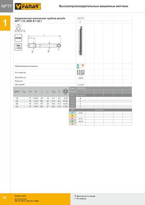 d1 d2 a NPTF Высокопроизводительные машинные метчики АмеGрwиiкnаtнmскeаtrяycкоznнyичISесOкаDяINт-р1у3бная резьба 800 1 NPT 1:16, ANSI B-1.20.1600 C P 1:16 l1 HSSE l2 DIN ~374 P M K Обрабатываемые материалы N S H Тип отверстия < 1,5d Изготовлен из HSSE Покрытие Сбег резьбы C / 2-3P Норма ~DIN-374 NPTF Ć d1 1''/P P l1 l2 Ć d2 a Точность INDEX D2-121101 1/8 - 27 0,941 90 15 7,0 5,5 8,45 4723 1/4 - 18 1,411 100 20 11,0 9,0 10,90 4727 3/8 - 18 1,411 110 22 14,0 11,0 14,30 4729 1/2 - 14 1,814 140 27 18,0 14,5 17,60 4731 ISO Vc (m/min) P 5-20 M - K 5-15 N 10-25 S - Пример заказа Доступный со склада 76 D2-121101-4723 По запросу 800 1/8" NPTF ~DIN-374 C HSSE