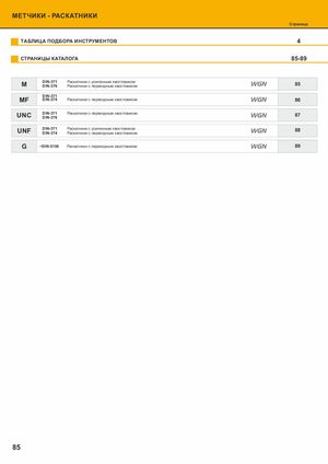 МЕТЧИКИ - РАСКАТНИКИ Страница ТАБЛИЦА ПОДБОРА ИНСТРУМЕНТОВ 4 Основная метрическая резьба ISO DIN-13 СТРАНИЦЫ КАТАЛОГА 85-89 DIN-371 Раскатники с усиленным хвостовиком2MDIN-376Раскатники с переходным хвостовиком WGN 85 DIN-371 MF DIN-374 Раскатники с переходным хвостовиком WGN 86 UNC DIN-371 Раскатники с переходным хвостовикомDIN-376 WGN 87 UNF DIN-371 Раскатники с усиленным хвостовикомDIN-374Раскатники с переходным хвостовиком WGN 88 G ~DIN-5156 Раскатники с переходным хвостовиком WGN 89 Обрабатываемые материалы Тип отверстия Изготовлен из Покрытие Сбег резьбы Tolerancja Пример заказа Dostępne z magazynu, cena w cenniku 85 Do szybkiej dostawy, cena na zapytanie