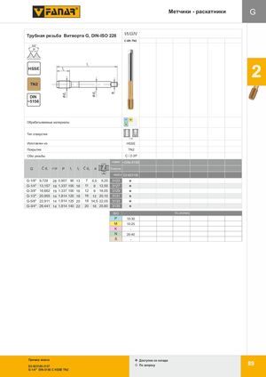 d1 d2 a G Метчики - раскатники G ОТрсунбонваняаяремзеьтбраичВеисткваоярртеазGьб, аDINSO-ISDOIN2-2183 WGN C-SR-TN2 HS5S5E0 P PM l1 HSSE l2 2 TN2 DIN ~5156 P M K Обрабатываемые материалы N S H Тип отверстия < 3d Изготовлен из HSSE Покрытие TN2 Сбег резьбы C / 2-3P норма ~DIN-5156 G Ć d1 1''/P P l1 l2 Ć d2 a Точность INDEX D2-923105 G-1/8" 9,728 28 0,907 90 13 7 5,5 9,25 3123 G-1/4" 13,157 19 1,337 100 16 11 9 12,55 3127 G-3/8" 16,662 19 1,337 100 16 12 9 16,05 3129 G-1/2" 20,955 14 1,814 125 18 16 12 20,10 3131 G-5/8" 22,911 14 1,814 125 20 18 14,5 22,05 3133 G-3/4" 26,441 14 1,814 140 22 20 16 25,60 3135 Tolerancja ISO Vc (m/min) P 10-30 M 10-25 K - N 20-40 S - Пример заказа DДoоsсtęтpупnнeoz сmоaсgкaлzаyдnаu, cena w cenniku D2-923105-3127 DПoоsзzаyпbрkоieсjуdostawy, cena na zapytanie 89 G-1/4" DIN-5156 C HSSE TN2