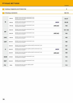 РУЧНЫЕ МЕТЧИКИ Ручные метчики Страница ТАБЛИЦА ПОДБОРА ИНСТРУМЕНТОВ 5 Gwint metryczny drobnozwojny ISO DIN-13 СТРАНИЦЫ КАТАЛОГА 95-112 Комплект ручных метчиков в количестве 3 штук DIN-352 Комплект ручных метчиков в количестве 2 штук 95-97 Ручной метчик чистовой F M Комплект ручных метчиков в количестве 3 штукDIN-352Ручной метчик чистовой F INOX 98-99 Комплект ручных метчиков в количестве 3 штук ~DIN-352 Ручной метчик чистовой F HRC40 100 Комплект ручных метчиков в количестве 3 штук DIN-2181 Ручной метчик чистовой F 101-103 MF Комплект ручных метчиков в количестве 2 штук ОбраDбаINты-2в1а8е1мые мРатуечрниоайлмыетчик чистовой F HRC40 104 4 Тип отверстия Комплект ручных метчиков в количестве 3 штук UNC DIN-352 Ручной метчик чистовой F 105 Изготовлен из Покрытие Комплект ручных метчиков в количестве 2 штук UNF DIN-2181 Ручной метчик чистовой F 106 Сбег резьбы Комплект ручных метчиков для трубных резьб в количестве 2 штук DIN-5157 Ручной метчик чистовой F 107 Комплект ручных метчиков для трубных резьб в количестве 2 штук G DIN-5157 Ручной метчик чистовой F INOX 108 Комплект ручных метчиков для трубных резьб в количестве 2 штук DIN-5157 Ручной метчик чистовой F HRC40 109 Комплект ручных метчиков в количестве 3 штук BSW DIN-352 Ручной метчик чистовой F 110 Комплект ручных метчиков в количестве 3 штук BSF DIN-2181 Ручной метчик чистовой F 111 Ручные метчики для стальных трубных резьб PG NGSy Ручной метчик чистовой F 112 Пример заказа Доступный со склада 94 По запросу