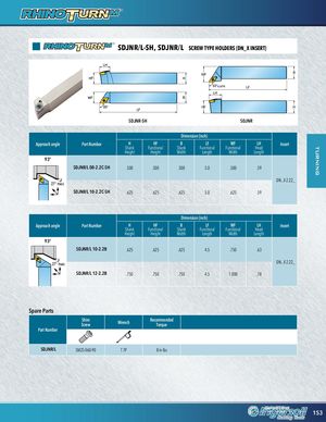 turning SDJNR/L-SH, SDJNR/L SCREW TYPE HOLDERS (DN_X INSERT) LH LH H WF B HF H 93°KAPR LF LH WBF B 93° LF 93° LF HF H SDJNR-SH SDJNR Dimension (inch) Approach angle PartBNumber H HF B LF WF LH Insert Shank Functional Shank Functional Functional Head Height Height Width Length Width Length 93° LF 93° LH SDJNR/L 08-2.2C-SH .500 .500 .500 5.0 .500 .59 27° max. 27° max. H 27° max. DN...X 2.22_ SDJNR/L 10-2.2C-SH .625 .625 .625 5.0 .625 .59 Dimension (inch) Approach angle Part Number H HF B LF WF LH Insert Shank Functional Shank Functional Functional Head Height Height Width Length Width Length 93° SDJNR/L 10-2.2B .625 .625 .625 4.5 .750 .63 27° max. DN...X 2.22_ SDJNR/L 12-2.2B .750 .750 .750 4.5 1.000 .78 Spare Parts ShimScrew Wrench RecommendedTorque Part Number SDJNR/L SM25-060-90 T 7P 8 in-lbs 153