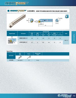 turning A-SCLNR/L SCREW TYPE BORING BARS WITH THRU COOLANT (CNMX INSERT) DCON Coolant DMIN WF 95° DCON LDRED H LF WF 95° LDRED H LF Dimension (inch) Approach angle Part Number DCONShankDiameterDMINMin. BoreDiameterLFFunctionalLengthWFFunctionalWidthLDREDReduced BodyDia. LengthHShank HeightInsert 95° A08M-SCLNR/L-2.2 .500 .63 6.00 .312 .84 .46 CNMX 2.22 A10R-SCLNR/L-2.2 .625 .81 8.00 .406 .96 .58 Spare Parts ShimScrew Wrench RecommendedTorque Part Number A-SCLNR/L SM25-060-90 T 7P 8 in-lbs 155
